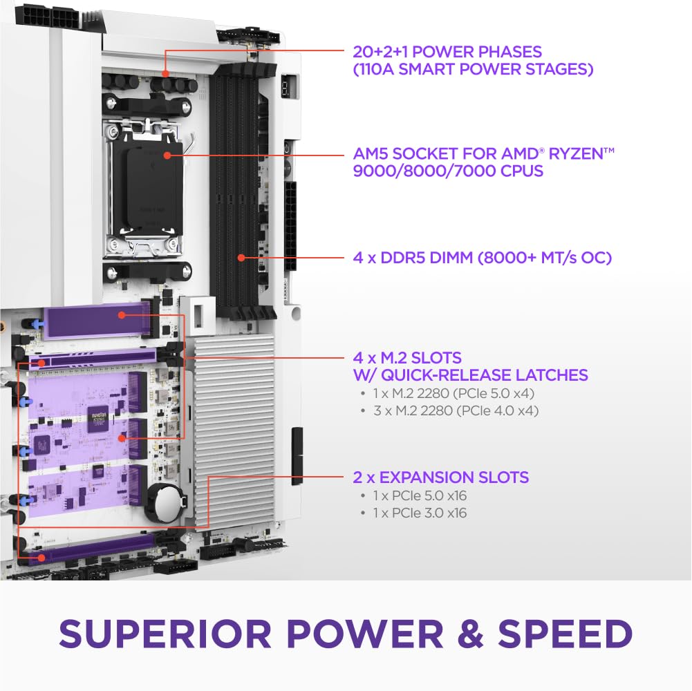 NZXT N9 X870E - Placa base para juegos AMD X870E AM5 ATX para Ryzen 9000/8000/7000-20+2+1, DDR5, 4X M.2, PCIe 5.0, Wi-Fi 7, 5GbE, USB 4 - Cierres de liberación rápida M.2, cubierta totalmente metálica, PCB blanco NZXT N9 X870E - Placa base para juegos AMD X870E AM5 ATX para Ryzen 9000/8000/7000-20+2+1, DDR5, 4X M.2, PCIe 5.0, Wi-Fi 7, 5GbE, USB 4 - Cierres de liberación rápida M.2, cubierta totalmente metálica, PCB blanco NZXT N9 X870E - Placa base para juegos AMD X870E AM5 ATX para Ryzen 9000/8000/7000-20+2+1, DDR5, 4X M.2, PCIe 5.0, Wi-Fi 7, 5GbE, USB 4 - Cierres de liberación rápida M.2, cubierta totalmente metálica, PCB blanco NZXT N9 X870E - Placa base para juegos AMD X870E AM5 ATX para Ryzen 9000/8000/7000-20+2+1, DDR5, 4X M.2, PCIe 5.0, Wi-Fi 7, 5GbE, USB 4 - Cierres de liberación rápida M.2, cubierta totalmente metálica, PCB blanco