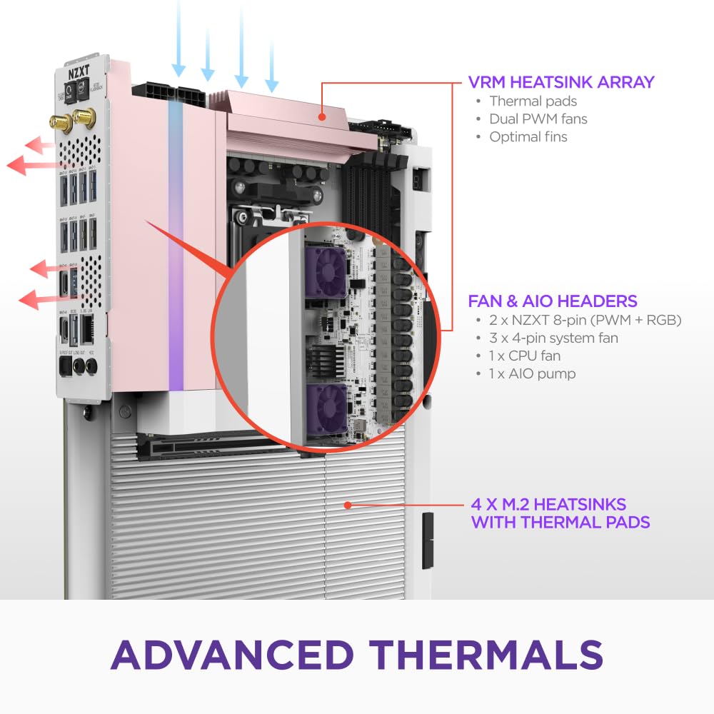 -ADVANCED COOLING — VRM heatsink array with thermal pads, dual PWM fans, and four dedicated M.2 heatsinks.