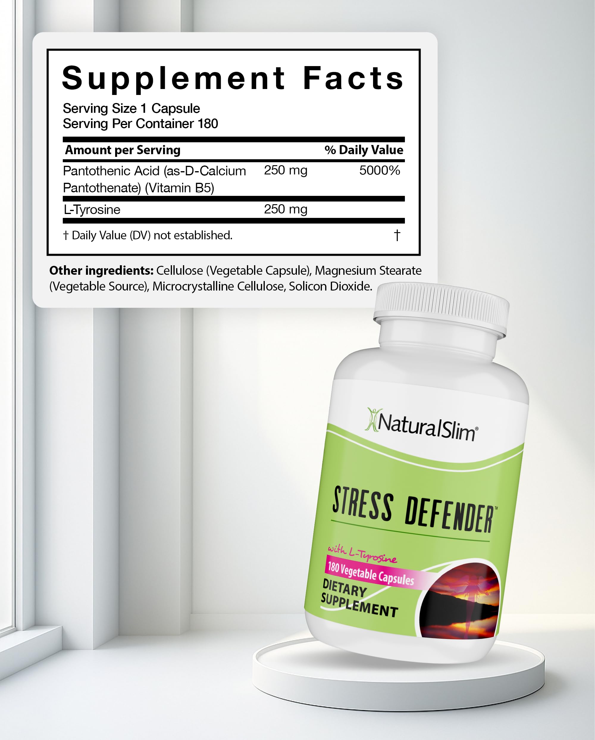 -Defend Against Daily Stress: Feel calmer and in control with Naturalslim Stress Defender. This cortisol supplement, formulated with pantothenic acid (Vitamin B5) and L-Tyrosine, supports a balanced mood and acts as a natural cortisol manager for stress relief.