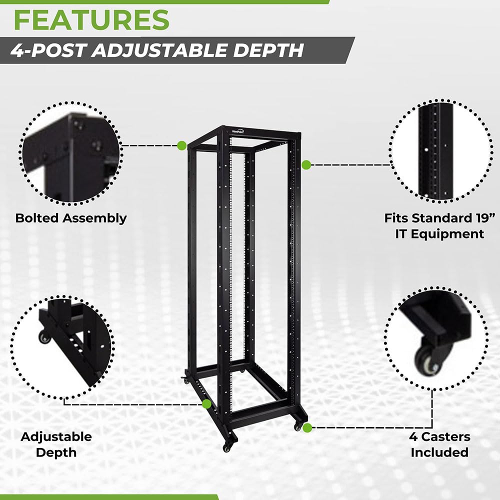NavePoint 42U Server Rack, rack de marco abierto de 4 postes para equipos de red de 19 ", 1000 mm, estacionarios/ruedas, acero negro, capacidad de peso máximo 881 lbs