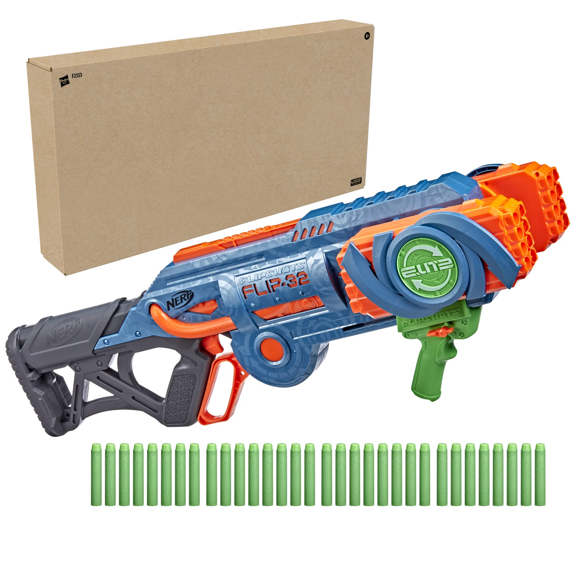 -FLIP INTO BATTLE: Nerf Elite 2.0 Flipshots Flip-32 blaster features 32 barrels, 16 facing front and 16 facing back. Fire darts from the 16 front barrels, then flip the rear barrels forward to keep on firing