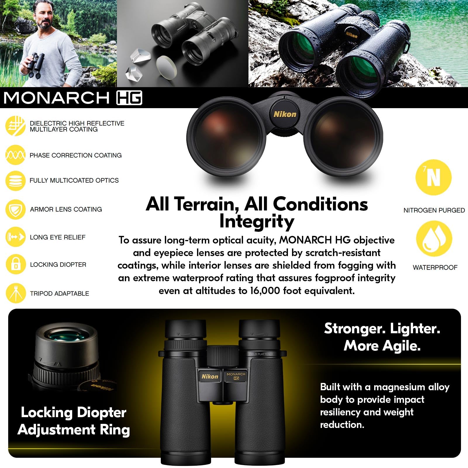 -OPTIMUM STRENGTH, IMPACT-RESILIENCE & WEIGHT REDUCTION - The Nikon MONARCH HG field binoculars feature a lightweight magnesium alloy body that combines strength, impact resistance, and portability; A streamlined, ergonomic design with rubberized panels ensures a secure, comfortable grip, making this optic a reliable companion for extended use in any environment