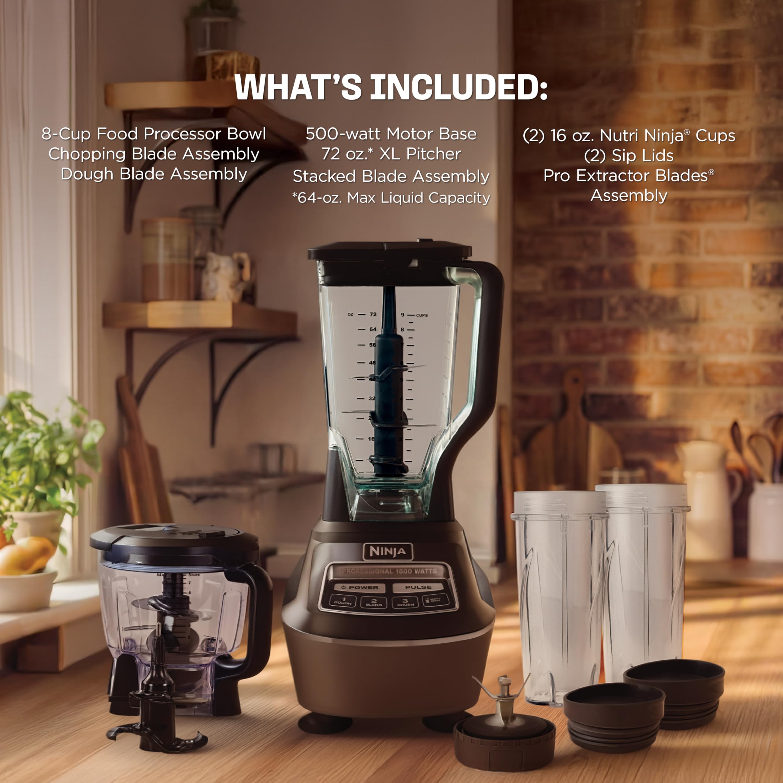 -WHAT’S INCLUDED: 1500-Watt Motor Base, 72-oz. Total Crushing Pitcher, Stacked Blade Assembly, (2) 16-oz. Nutri Ninja Cups with Spout Lids, Pro Extractor Blades Assembly, 8-cup Precision Processor Bowl, Chopping Blade, Dough Blade.