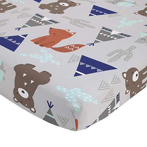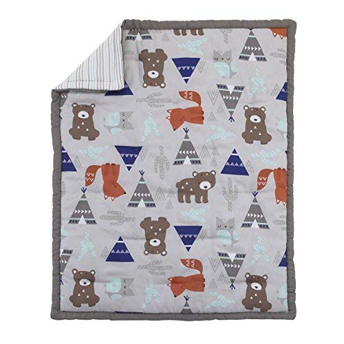 The NoJo - Dreamer Collection - Woodland Animal Tribe - 8-Piece Crib Bedding Set - Includes: 1 Comforter, 2 Crib Sheets (2 Prints), 1 Crib Skirt, 1 Printed Pillow, 1 Diaper Stacker, 1 Coral Fleece Blanket with Applique, 1 Changing Pad Cover. This group has a true tribal feel with woodland creatures, rambling bears, fast fox and wise owl among the teepees and desert cactus. Featured in earthy shades of grey, navy, tan, rust and aqua. The comforter comes in grey, with a navy border, printed with the woodland animals, teepees and cactus in shades of grey, navy, rust, tan and aqua. The back is a wiggly stripe in grey, aqua and white. This collections is made of 100% Cotton Sateen fabrics, 200 TC. The first crib sheet comes in the matching animal tribe print, the second sheet is the grey, aqua and white wiggly stripe. The crib skirt is solid navy with a 16" drop length. The decorative pillow measures 14" x 10" and comes in the animal tribe print with grey trim and wiggly stripe back. Keep your nursery tidy with the handy animal tribe print diaper stacker accented with navy trim and the fun wiggly stripe print at the top. This set also includes a cozy baby blanket made of coral fleece fabric, in navy blue with grey teepee applique, measures 30" x 40". And don't forget the plush changing pad cover in solid navy coral fleece, measures 32" x 6" x 16", adds comfort and style to your changing area.