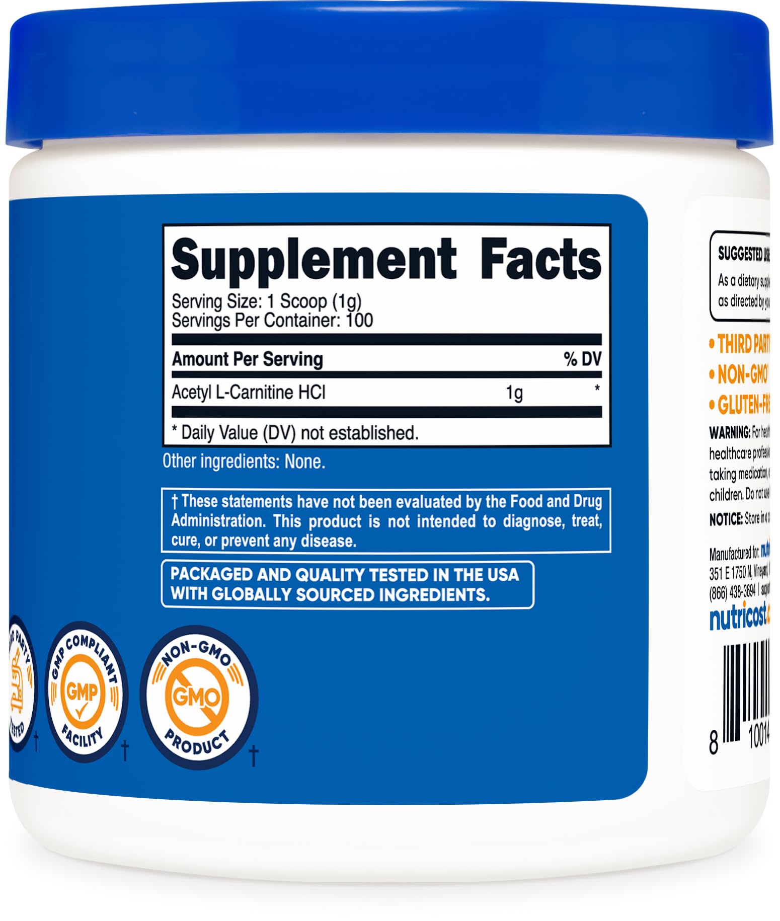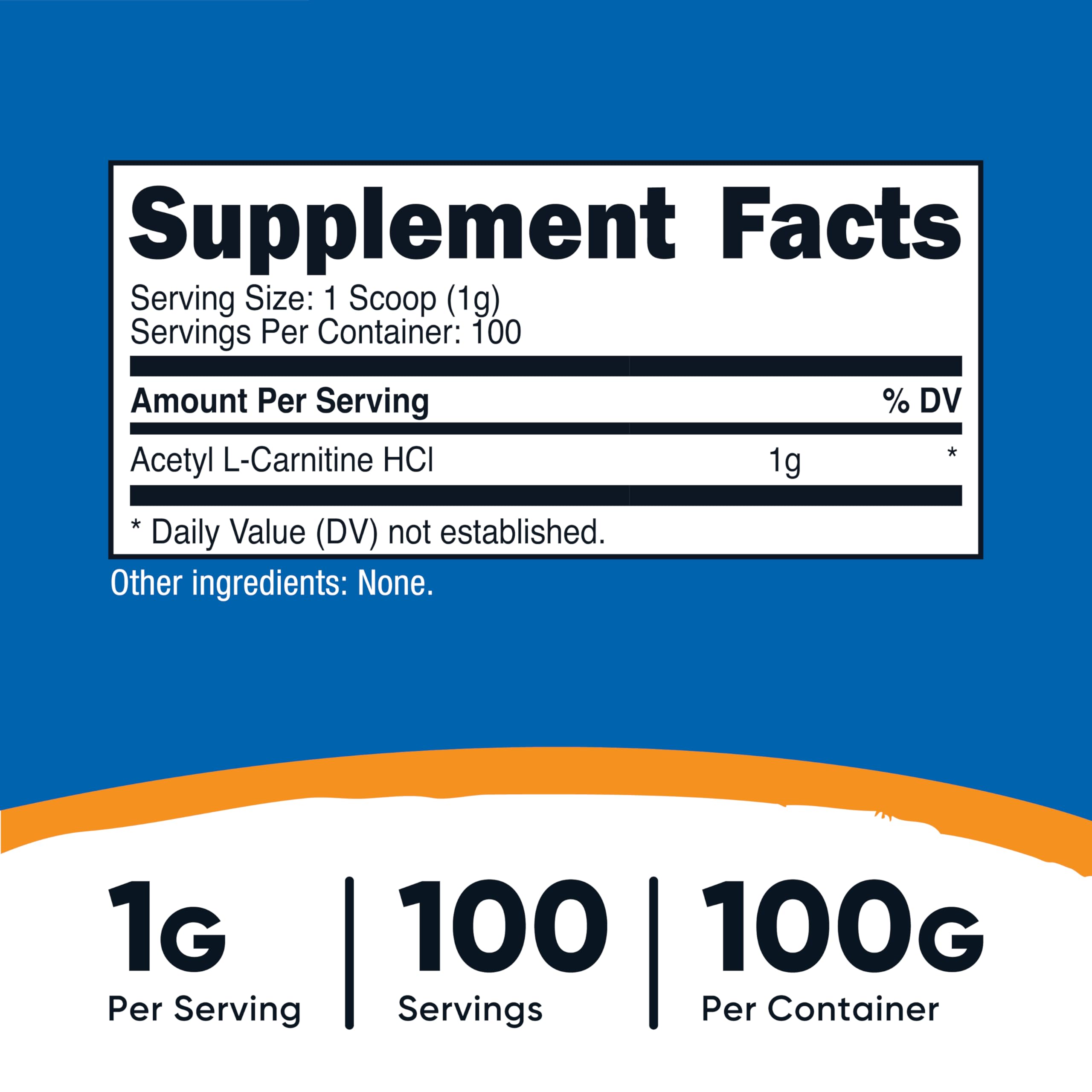 Nutricost Acetil L-Carnitina HCI (ALCAR) 3.53 oz por contenedor – 0.04 oz por porción – Sin OGM, sin gluten, sin sabor