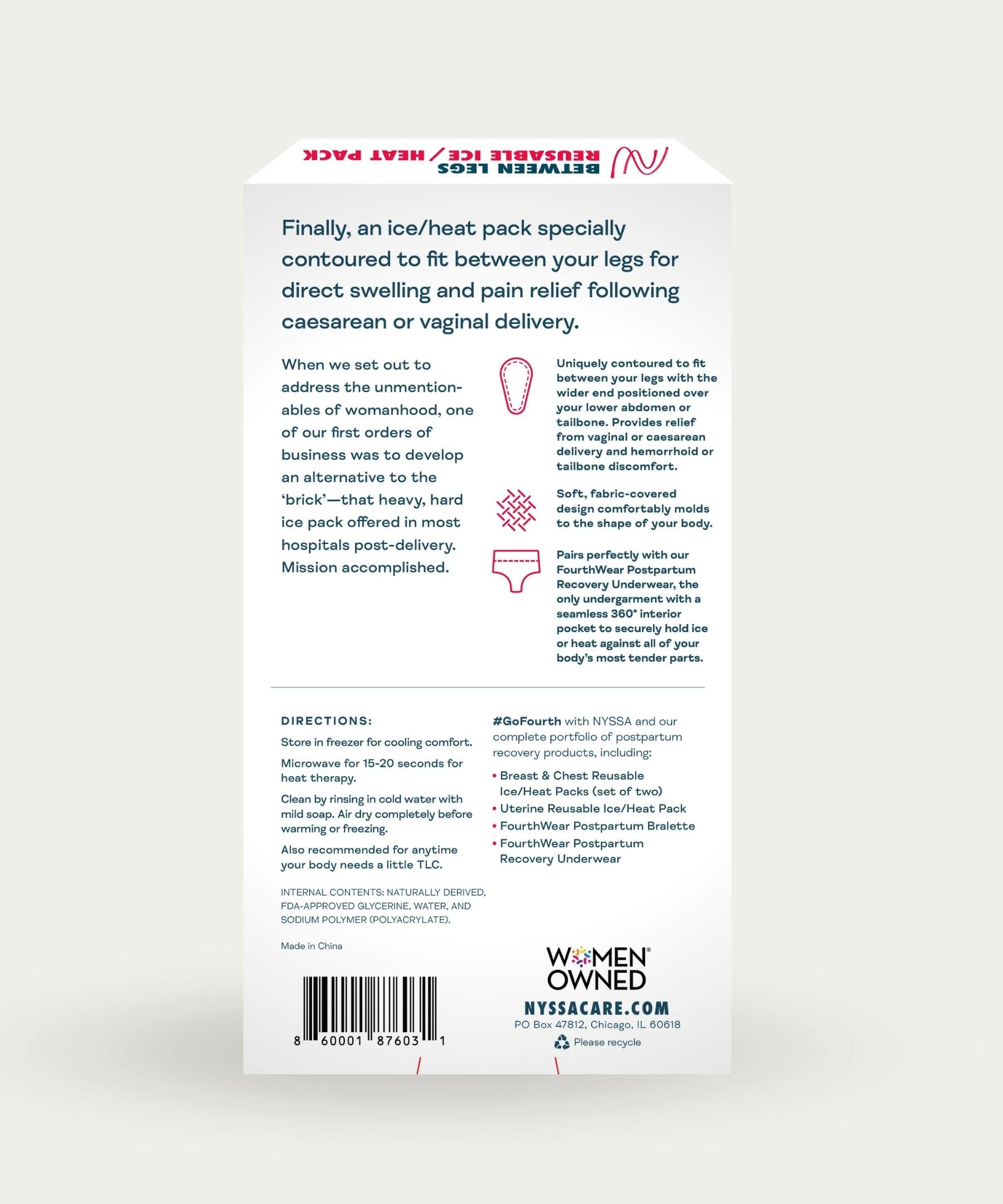 Nyssa Between-Legs Ice/Heat Pack – Almohadilla reutilizable de terapia de frío y calor para la recuperación posparto del parto – Diseño contorneado para comodidad y soporte de cesárea – Se adapta a la ropa interior FourthWear