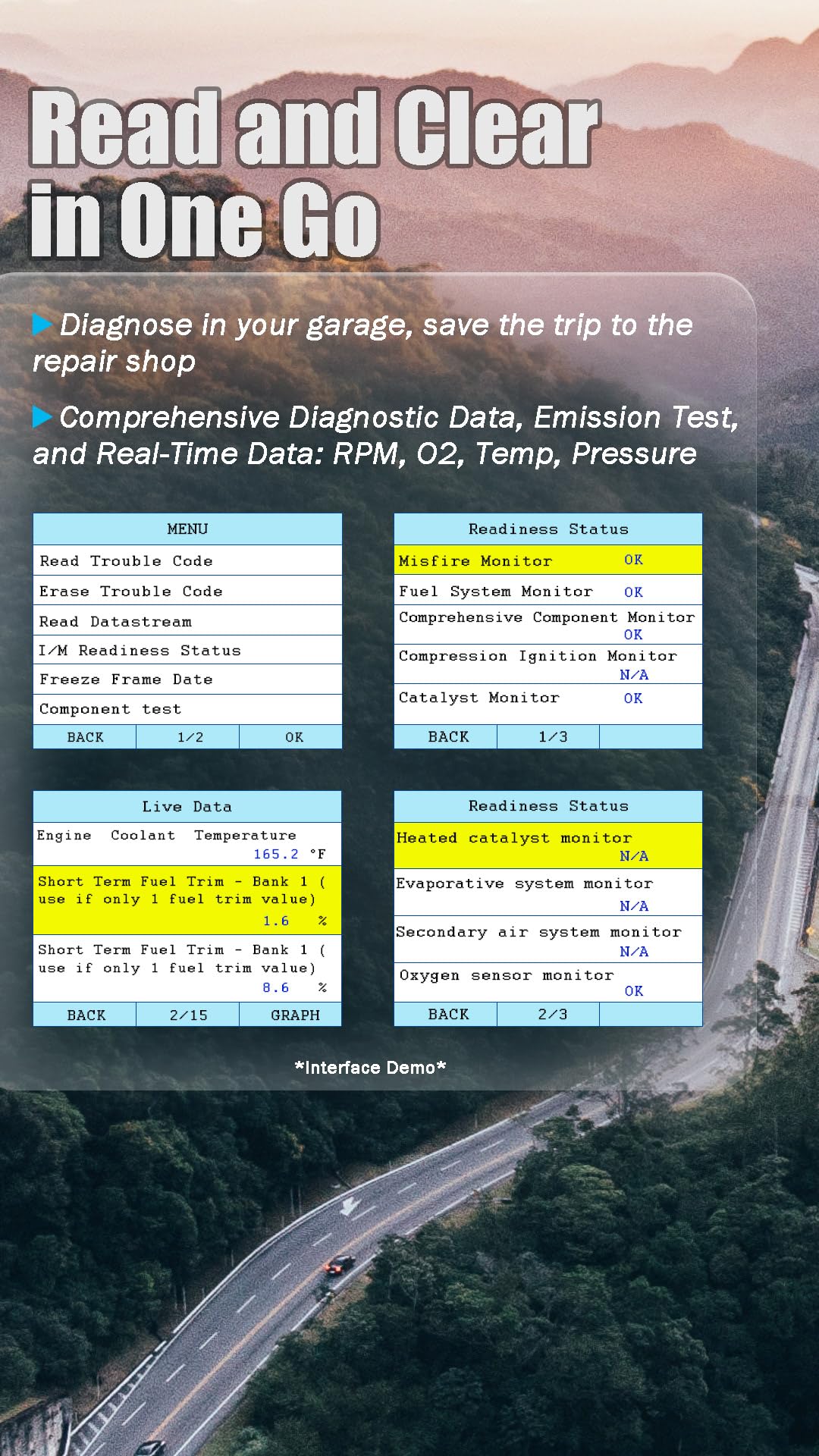 -[Effortless Diagnostics]: Read and clear engine trouble codes, turn off the check engine light, and reset monitors with ease. Access DTC definitions, freeze frame data, and perform on-board monitor tests. It also supports I/M Readiness status, O2 sensor tests, and EVAP system tests. Simplify your car diagnostics in one go.