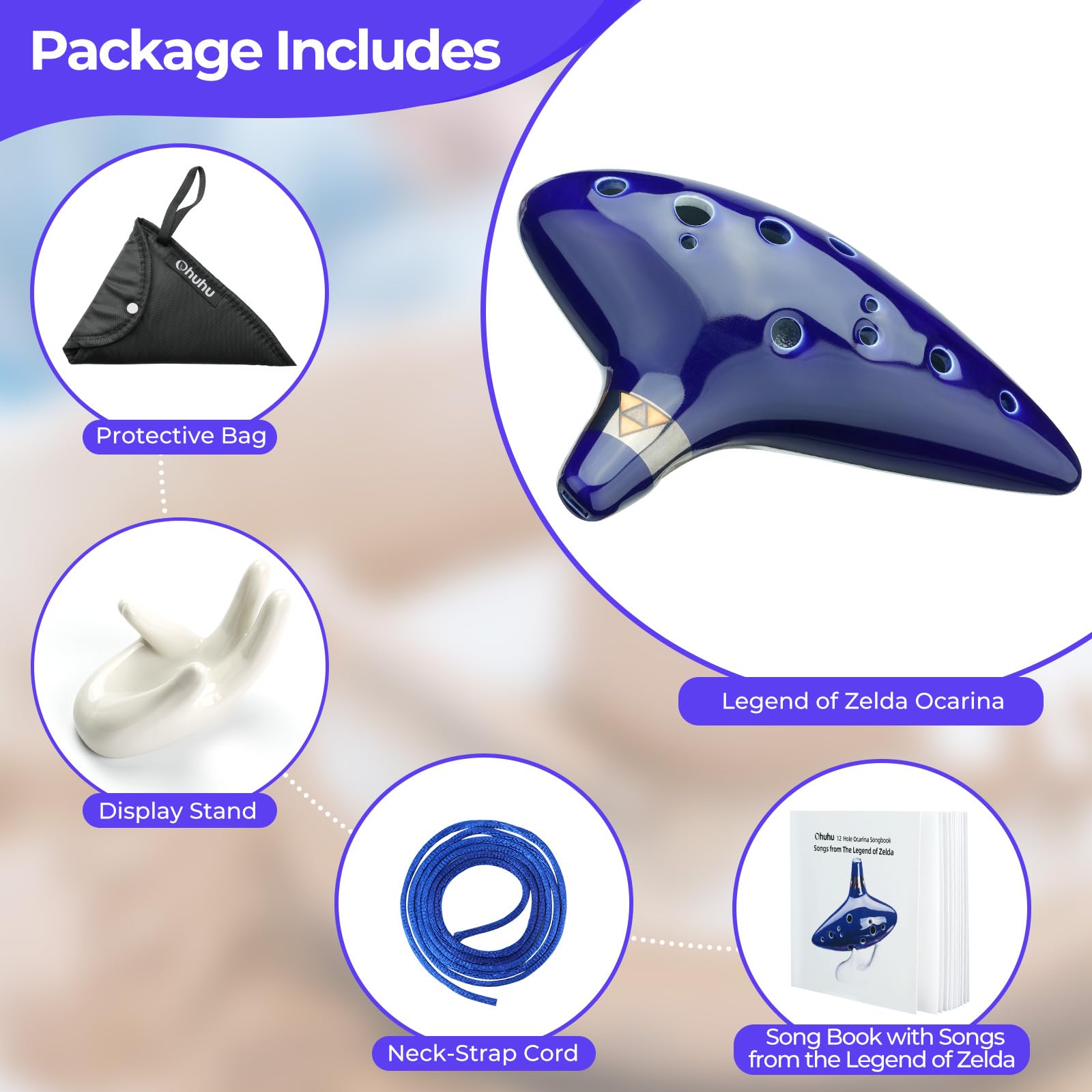 -All-in-One Instrument: Experience the versatility of the Ohuhu Zelda Ocarina. Not only is it a 12-hole ceramic flute, but it also comes with a complete set that includes a Zelda songbook, a display stand, a neck strap, and a protective bag