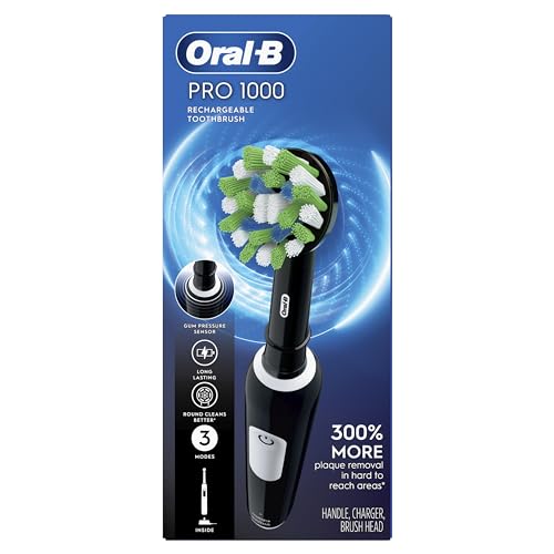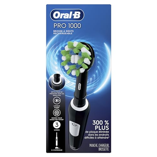 Product Description The Oral-B Pro 1000 rechargeable electric toothbrush provides a clinically proven superior deep clean in hard-to-reach areas vs. a regular manual toothbrush. 300% MORE plaque removal along the gumline versus a regular manual toothbrush. The professionally inspired design of the CrossAction brush head surrounds each tooth with bristles angled at 16 degrees. The Oral-B Pro 1000 has 3D cleaning action that oscillates, rotates, and pulsates to break up and remove plaque along the gumline than a regular manual toothbrush. The pressure sensor stops pulsations if you brush too hard to prevent harmful over-brushing and there are 3 modes. The toothbrush also includes an in-handle timer to help you brush for a dentist-recommended two minutes. Best of all, it is brought to you by Oral-B - the #1 brand used by dentists worldwide.* *Based on surveys of a representative worldwide sample of dentists carried out for P&G regularly. Do not use on children under age 3. Replace brush (head) every 3 months or sooner if brush head becomes worn. Manufacturer Contact Information P&G Plaza, Cincinnati, OH 45202
