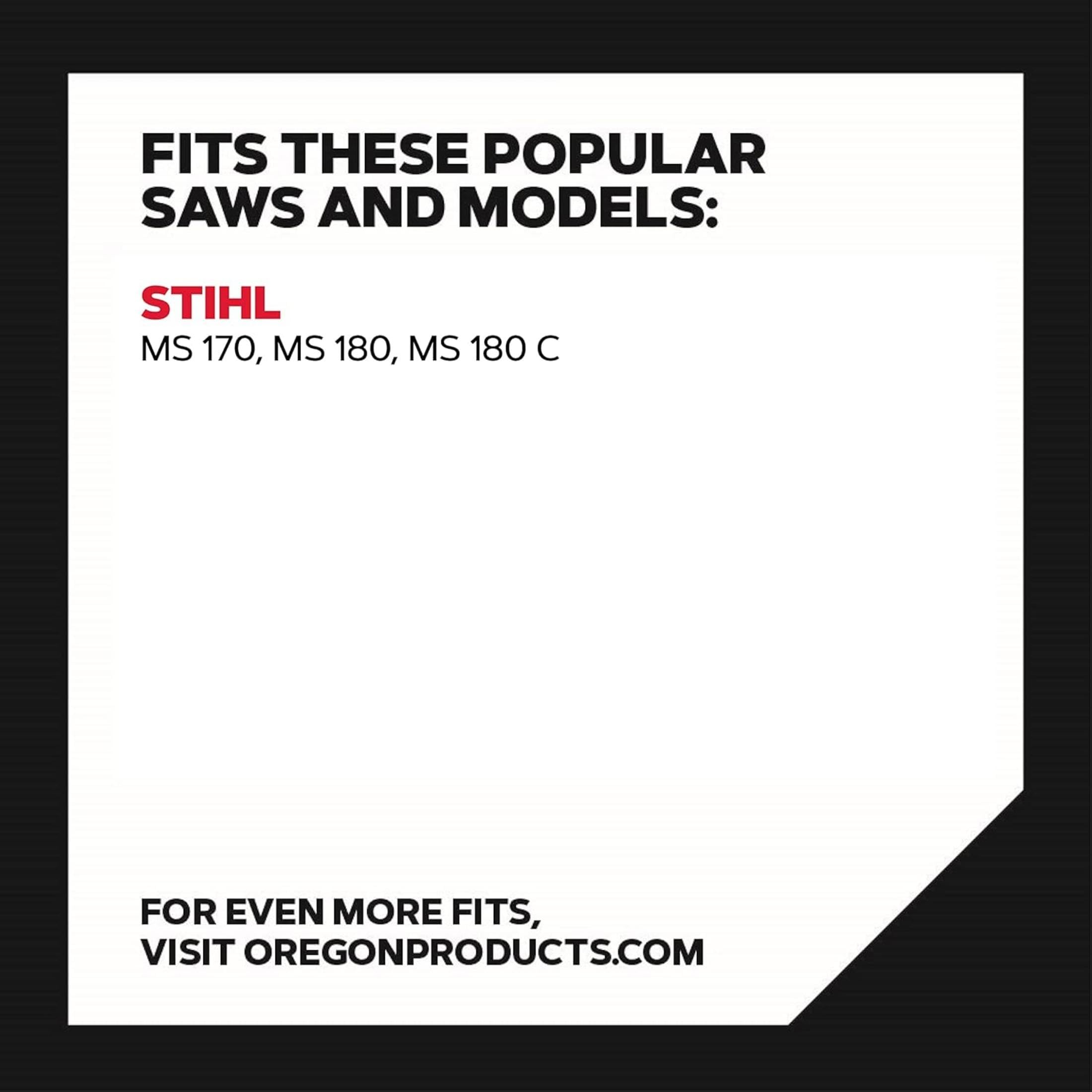 This Oregon 14-Inch Replacement Chainsaw Bar and Chain made to fit a variety of Stihl models, the S50 chain features an 50 drive link chain with 3/8-inch pitch and .050-inch gauge. These specifications make it perfect for landscaping professionals who occasionally cut wood. The low-vibration chain offers excellent performance, easy maintenance and low kickback for enhanced safety, while the heat-treated semi-chisel chain ensures smooth cutting and a high tolerance for debris.This saw chain meets the kickback performance requirement of ANSI B175.1-2012. Compatible with a wide range of Stihl models, including (but not limited to): Stihl 009, 009 L, 010, 011, 012, 015, 017, 018, 019, 020, 021, 023, E 10, E 14, E 140, MS 170, MS 171, MS 180, MS 180 C, MS 180 C-B, MS 180 C-BE, MS 180 G, MS 181, MS 181 C, MS 181 C-BE, MS 191T, MS 192 C, MS 192 C-E, MS 192 T, MS 193, MS 193 C-E, MS 193T, MS 200T, MS 201, MS 201 C, MS 201 C-E, MS 201 C-EM, MS 201 T, MS 201 T C-M, MS 210, MS 210 C, MS 211, MS 211 C-BE, MSE 140, MSE 140 C, MSE 180, MSE 180 C.