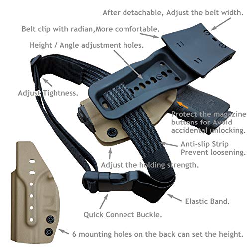 KYDEX holsters for tactical equipment are a wise choiceThe KYDEX forGlock Holster is hand-crafted from a sturdy 0.08" KYDEX alloy plastic plate. This for Glock Holster OWB is very thin and light, less than 100g. It is waterproof, sweat-resistant, and has high strength, high toughness, impact resistance, wear resistance and Anti-aging properties. It can be used under a variety of conditions. So you can always rely on it to save your life.High quality and excellent performanceHigh matching, no sloshing, no jitter, no wear. The entrance is widened, easy to insert and pull out, avoiding scratching the gun body and perfectly protecting your gun.PoLe.Craft Kydex holster has a Posi-Click Audible Retention Lock system, and the pistol has a crisp "click" sound when it is inserted, so you know that your gun is firmly seated. Adjust the screw to achieve the tightness adjustment, to achieve the best extraction strength, and strive for the fastest self-storage time.Disassembly-free belt hanging plate, convenient, comfortable, stableThe holster can be worn and removed without disassembling the belt, Convenient and easy to use. Belt clip accurately matches the 1.5 "/1.75" / 2 "belt. It has a non-slip groove inside and no extra space. It can effectively prevent the holster from following the upward movement when pulling the gun, Position to further increase stability. Holster's Height and Angle can be adjusted as needed to obtain the best use habits. The back of the belt clip is curved to fit the waist for optimal comfort.Lifetime WarrantyWe offer a lifetime warranty to ensure any defects in the manufacturer. If our for Glock holster is not performing as promised under normal use, please return it to the replacement or refund the purchase price.Put your gun at your fingertips and let it protect you wherever you are. Add PoLe.Craft for Glock Holster OWB to your cart now.