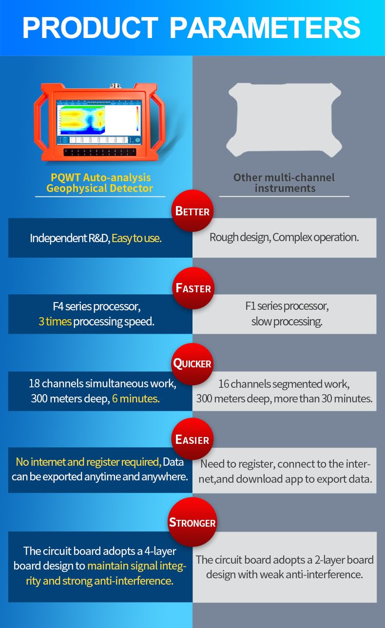 -Advanced 8th Generation Technology: Utilizing the natural electric field frequency selection method, our PQWT-GT Series multi-channel prospecting instrument delivers precise detection for groundwater sources with enhanced accuracy and efficiency.