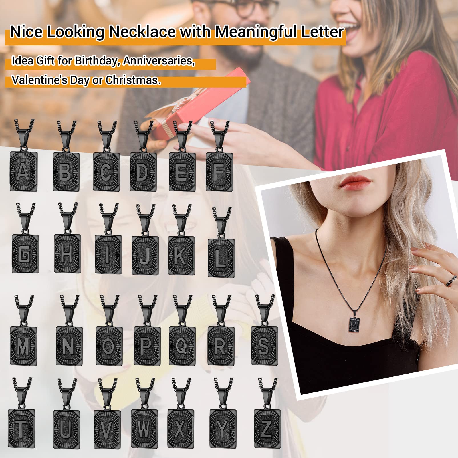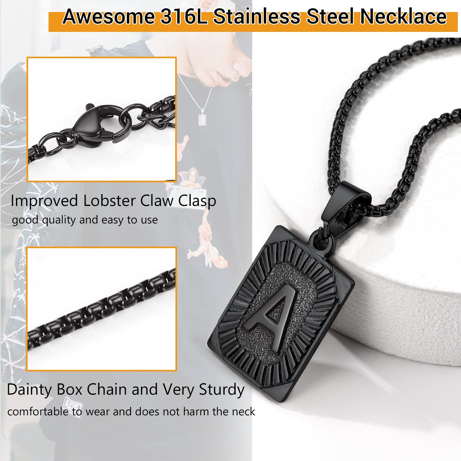 PROSTEEL Collar personalizado con letra A, nombre grabado, cadena negra, colgante cuadrado de acero inoxidable, collar con inicial, regalos personalizados para hombres