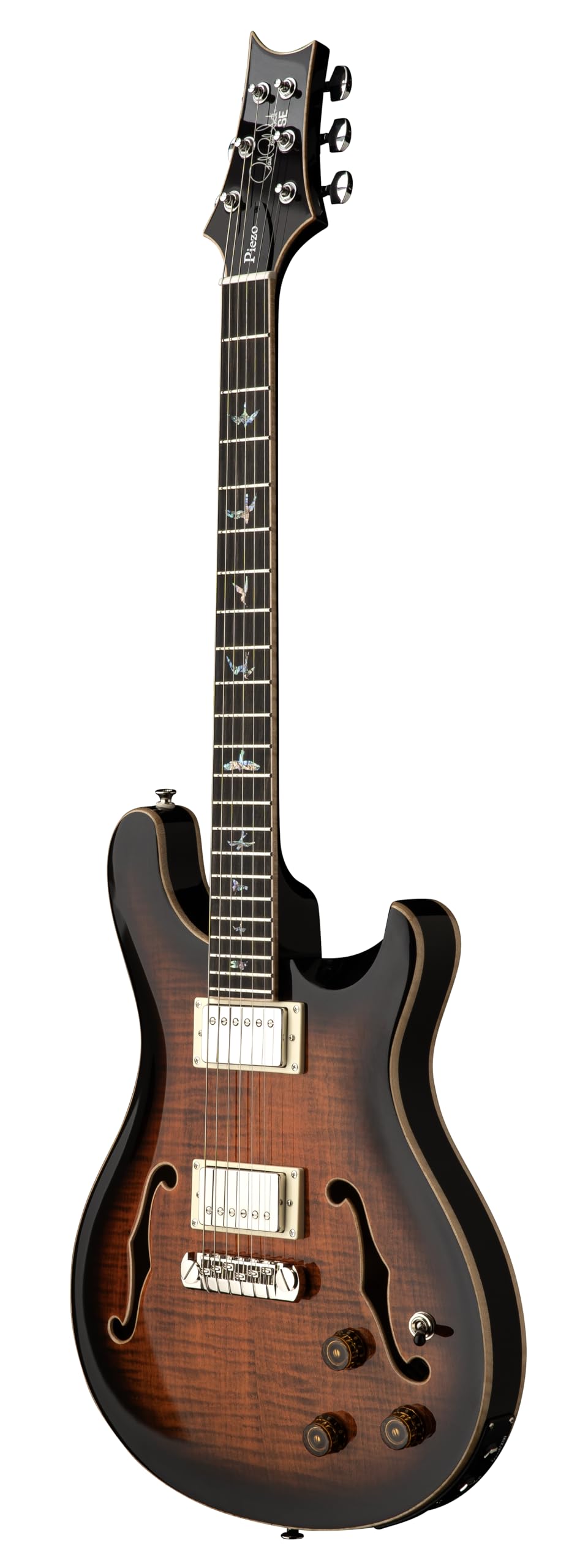 The SE Hollowbody II Piezo combines the balanced, clear, resonant tone of a hollowbody instrument with the power and stability of a solid-body electric guitar. Constructed with a maple back and top with mahogany sides, the SE Hollowbody II Piezo offers a light shimmer and snap in an attractive package. The 58/15 LT “S” pickups deliver clarity and balance that sound big and musical in a hollowbody platform. Boasting an LR Baggs/PRS Piezo system, the SE Hollowbody II Piezo provides musicians with the versatility of wielding both acoustic and electric tones in one instrument. The instrument is designed with two discrete volume controls (magnetics and piezo) and output jacks (mix/piezo and magnetics). Players can plug into the “Mix/Piezo” jack and use the individual volume controls to blend the 58/15 LT “S” pickups with the piezo’s acoustic tones. Alternatively, players can plug into the jacks separately, so the guitar can run magnetic pickups into an amp and run the piezo through an acoustic amp or DI into the soundboard. When using the magnetic output jack in isolation, the piezo battery is bypassed completely, acting as a failsafe (in this scenario, the magnetic pickups still work even if the piezo battery has run out of juice).