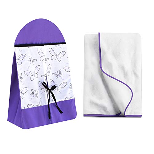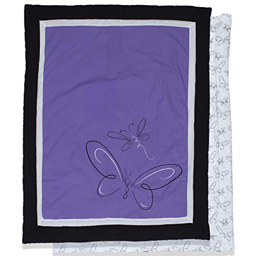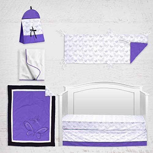 - Set Includes Quilt, Crib Rail Guard Cover, Fitted Crib Sheet, Crib Skirt, Diaper Stacker, and Fleece Blanket - Set has matching accessories such as blanket; lamp shade; changing pad cover; and boppy cover - Made with a cotton poly blend material - Freshens up quickly with a simple machine wash and dry Color:Purple-|-Size:6A beautiful framework of butterflies and dragonflies, accented in a deep lavender, frolic randomly on a soft white background. Our Pam Grace Creations 6pc Butterflies and Dragonflies bedding set comes with Reversible Quilt, Crib Sheet, Crib Skirt, Reversible Crib Rail Guard, Receiving Blanket and Diaper Stacker. Other matching items available for your Butterflies and Dragonflies Nursery Set include Reversible Chenille Dot Blanket, Bopp Cover, Changing Pad Cover and Lamp Shade.