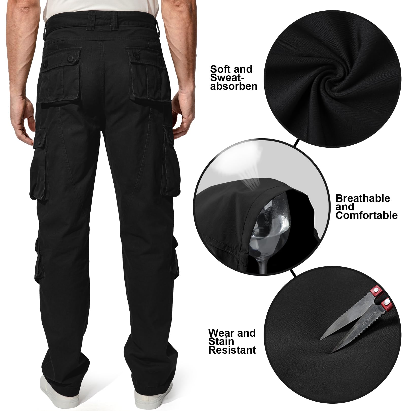 -Men's cargo work pants for outdoor activities,Front slant pocket x2; thigh buttoned flap pocket x2;leg buttoned flap pocket x2; rear buttoned flap pocket x2; Left slant decoration zipper pocket x1. Easy care wrinkle resistant fabrics, roomy pockets & sturdy zippers & buttons.