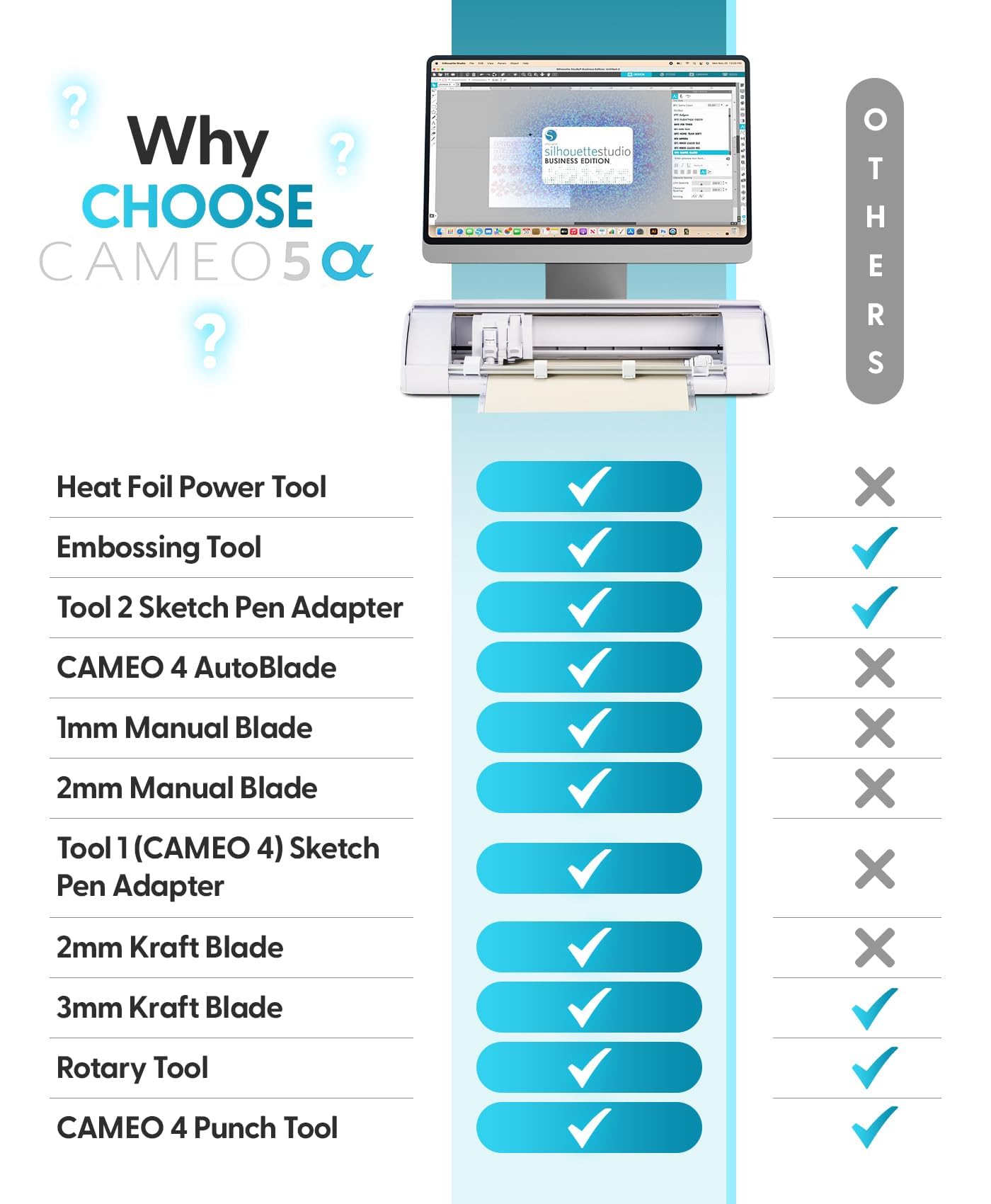 Silhouette America Cameo 5 Alpha (α) - Máquina de corte inteligente, blanco clásico (paquete inicial) - Incluye software Designer Edition, 24 hojas de vinilo Oracal, kit de herramientas y 25 diseños gratuitos para bricolaje