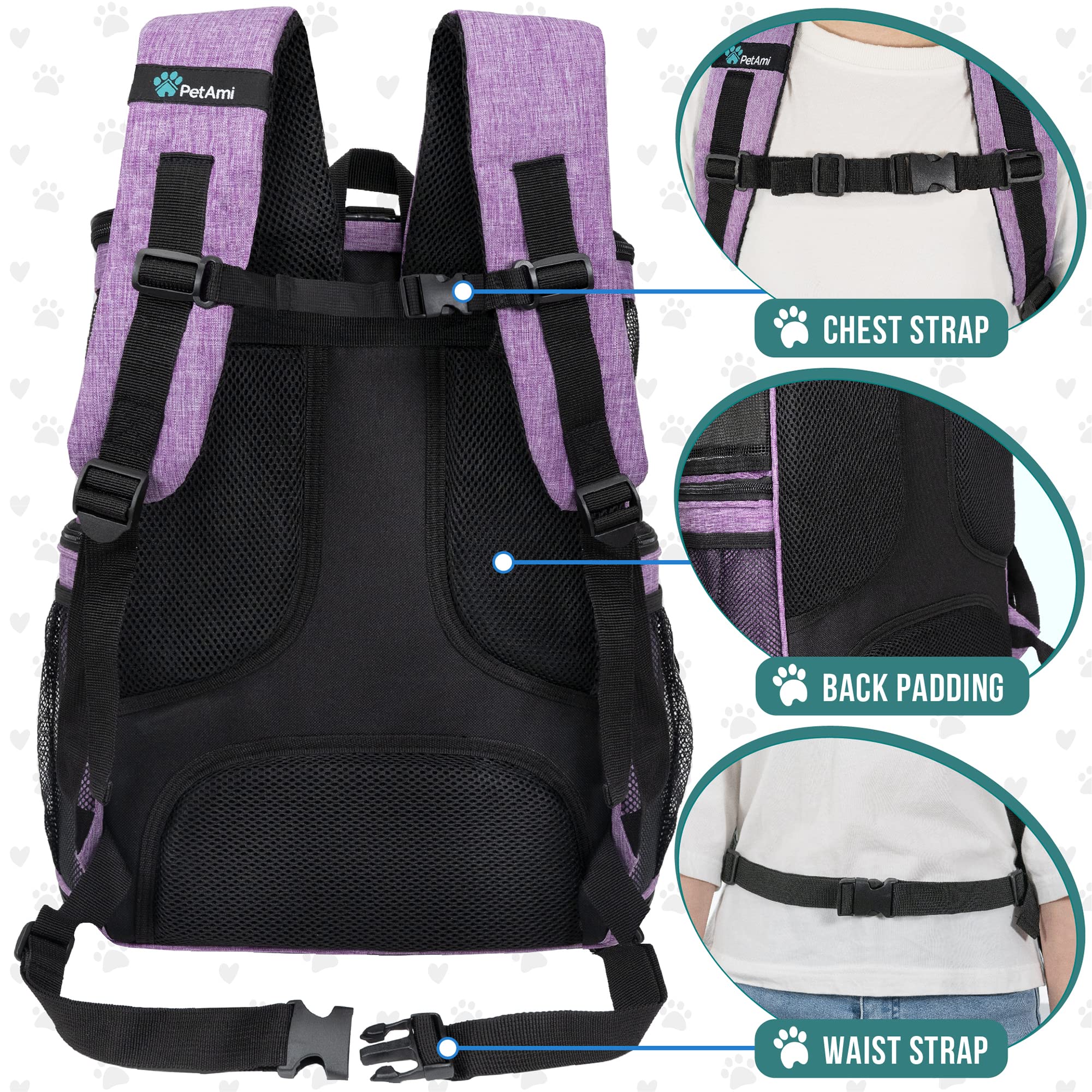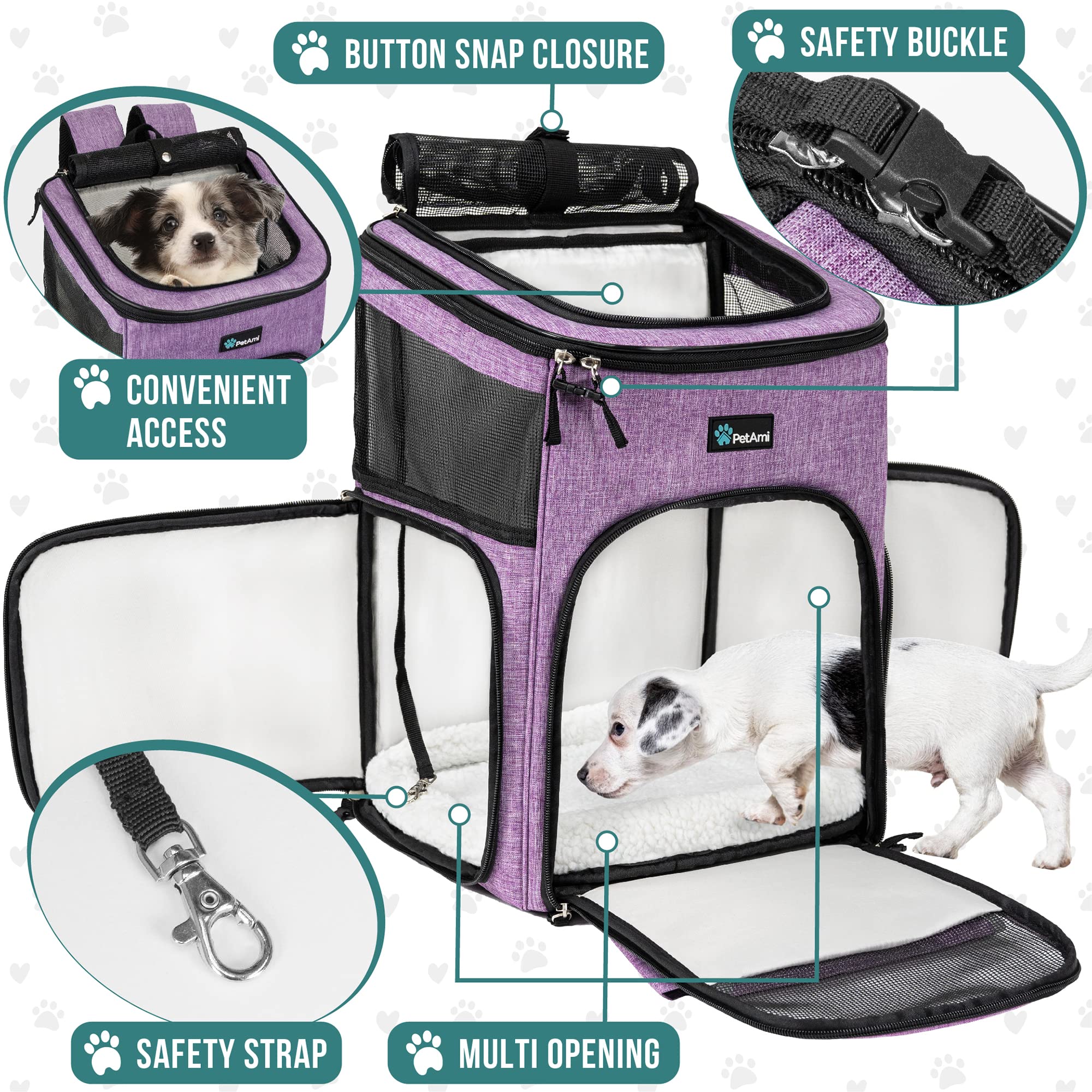 PetAmi Mochila para perros, mochilas para gatos aprobadas por aerolíneas para transportar gatos pequeños y grandes, mochila para transportar mascotas, lado suave ventilado para viajes, senderismo, camping, máximo 18 libras, color morado