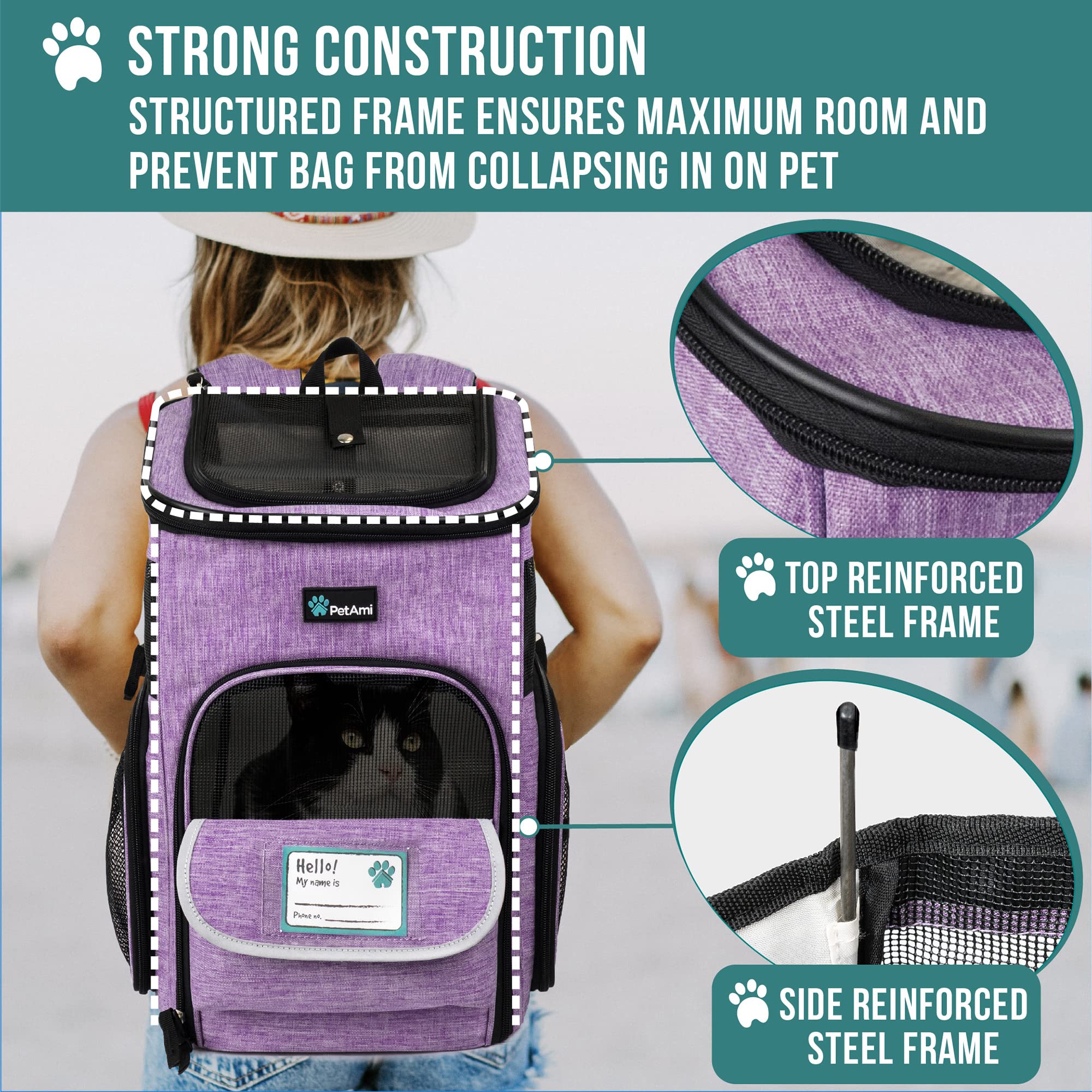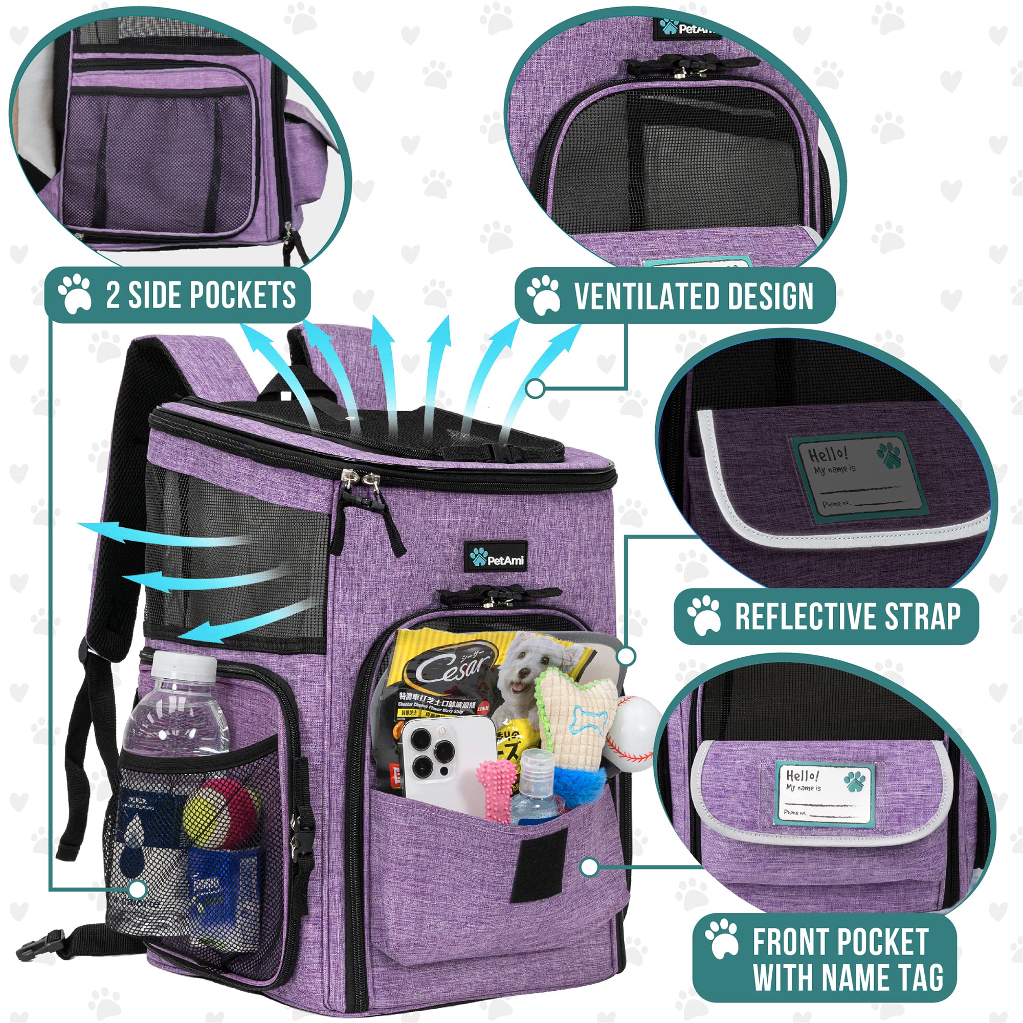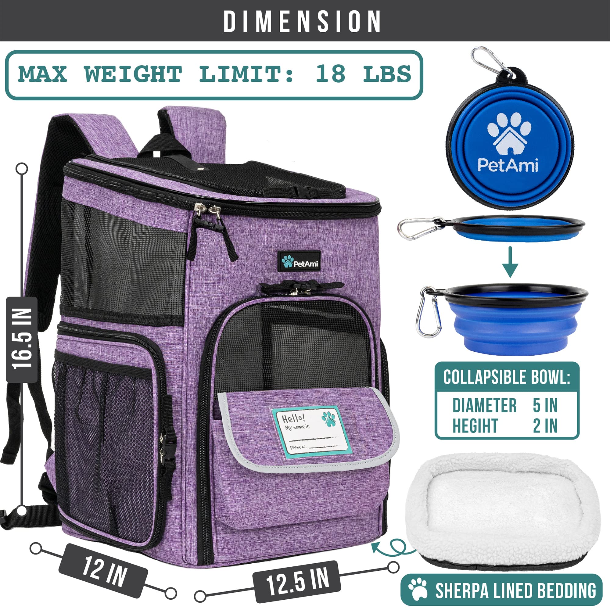 -PET BACKPACK CARRIER FOR DOG & CAT: PetAmi Pet Carrier Backpack measures 16.5 x 12.5 x 12 inch with max weight limits of 18 lbs. This cat backpacks for carrying cats or dog carrier backpack for small dogs and small/medium-sized pets is a well-ventilated pet backpack for walking, hiking, traveling, or outdoor activities while prioritizing your pet's safety. Equipped with spacious pockets for dog stuff and essentials, our cat carrier backpacks come with a collapsible bowl and Name Tag ID.