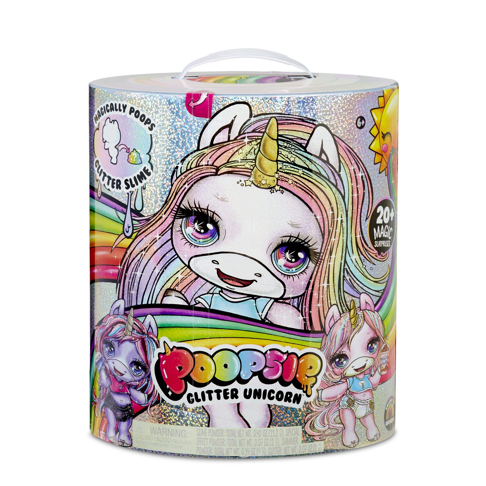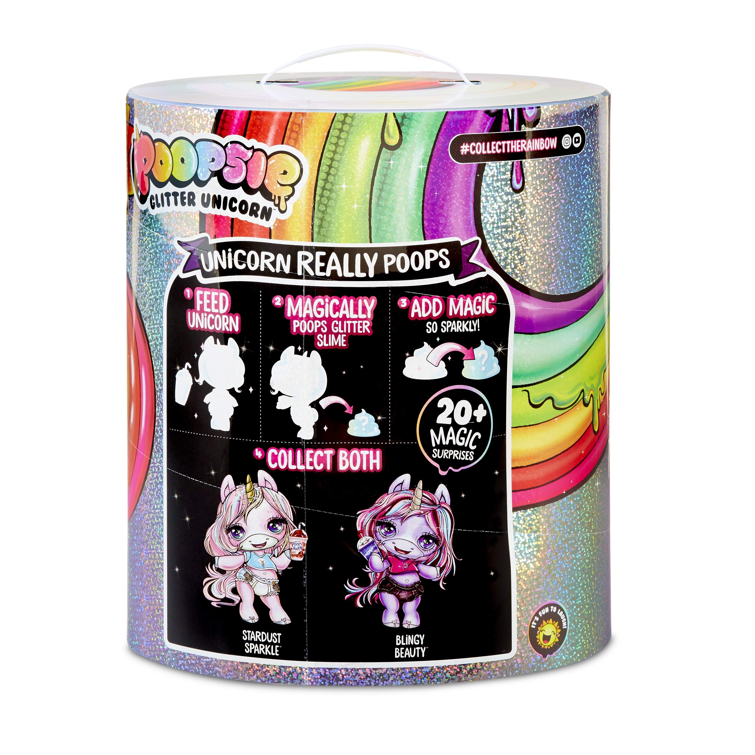Poopsie glitter Unicorn is the sparkly Unicorn with over 20 glittery surprises that magically poops glitter slime! She's gotten a stunning, sparkly makeover with glitter from head to toe. Unroll either Stardust sparkle or bling beauty, each with gorgeous, brushable glitter hair and a cute outfit. Feed her Unicorn food, sit her on her potty, and she creates surprise, collectible sparkly Unicorn poop (slime)! transform the slime with Unicorn magic, Unicorn shimmer, and Unicorn sparkle and store it in the glittery key chain! Includes one Poopsie glitter Unicorn, parody bottle, spoon, sparkly collectible key chain, t-shirt, diaper, potty, 4 Unicorn food slime packets, 2 Unicorn magic packets, 4 shimmer packets, 1 Unicorn sparkle packet, 1 hair brush, and 1 measuring cup. Collect each Poopsie glitter Unicorn!