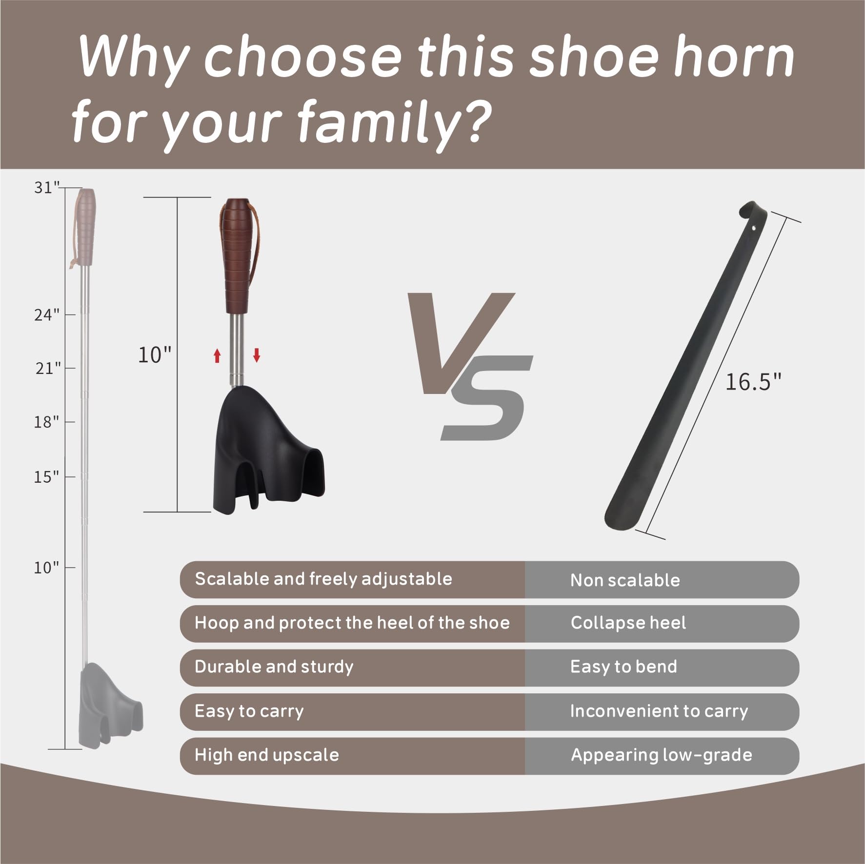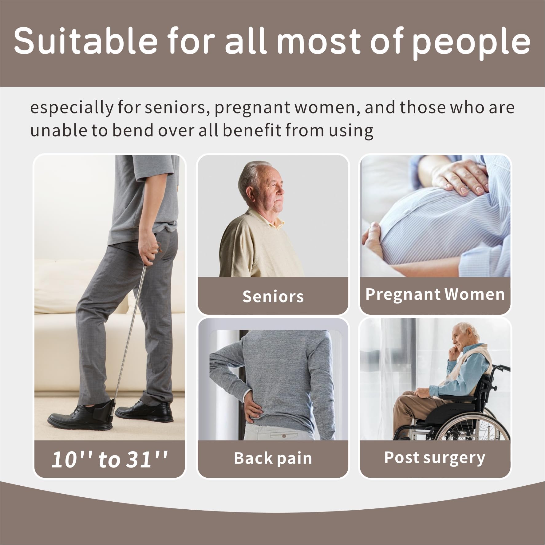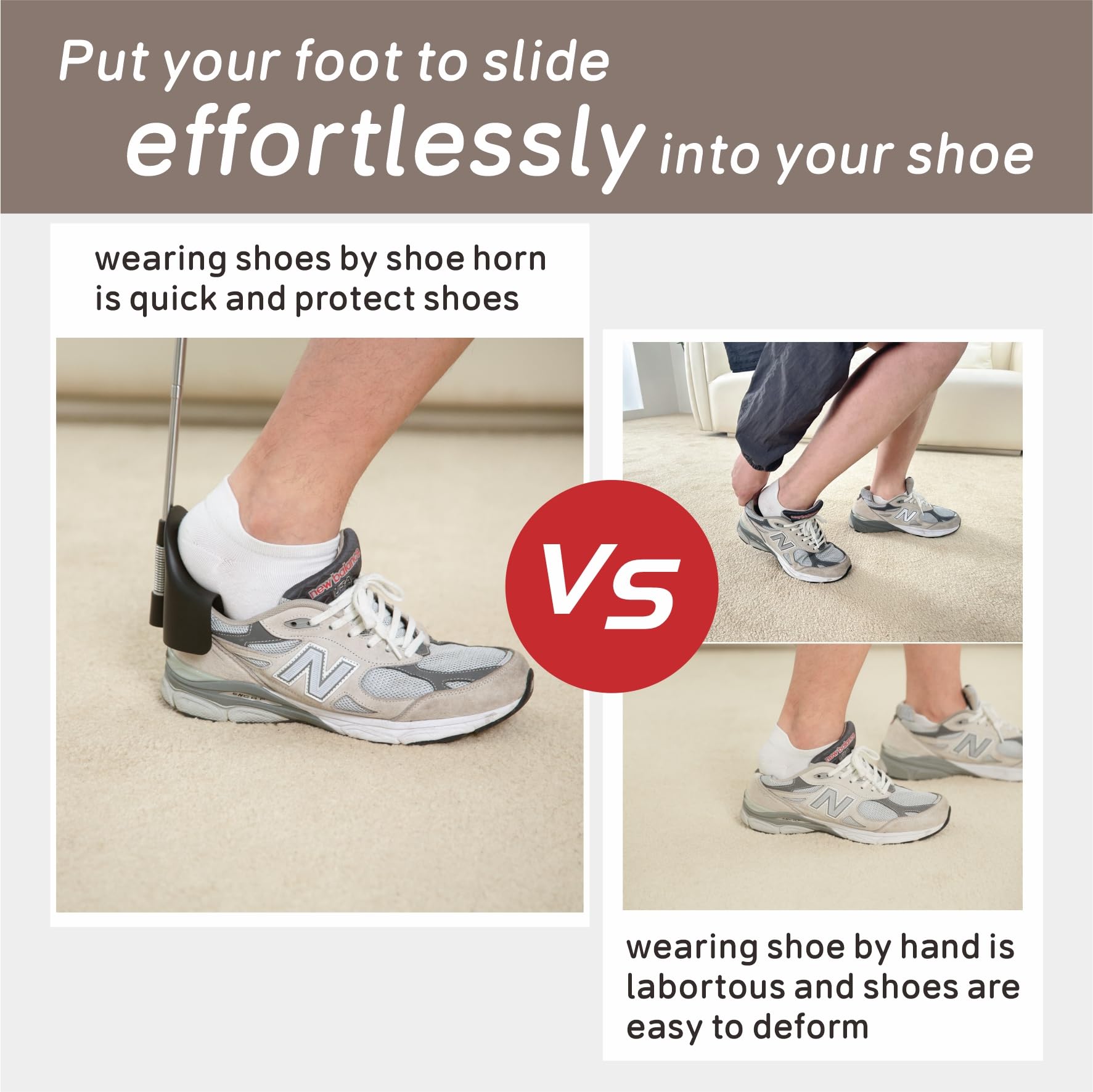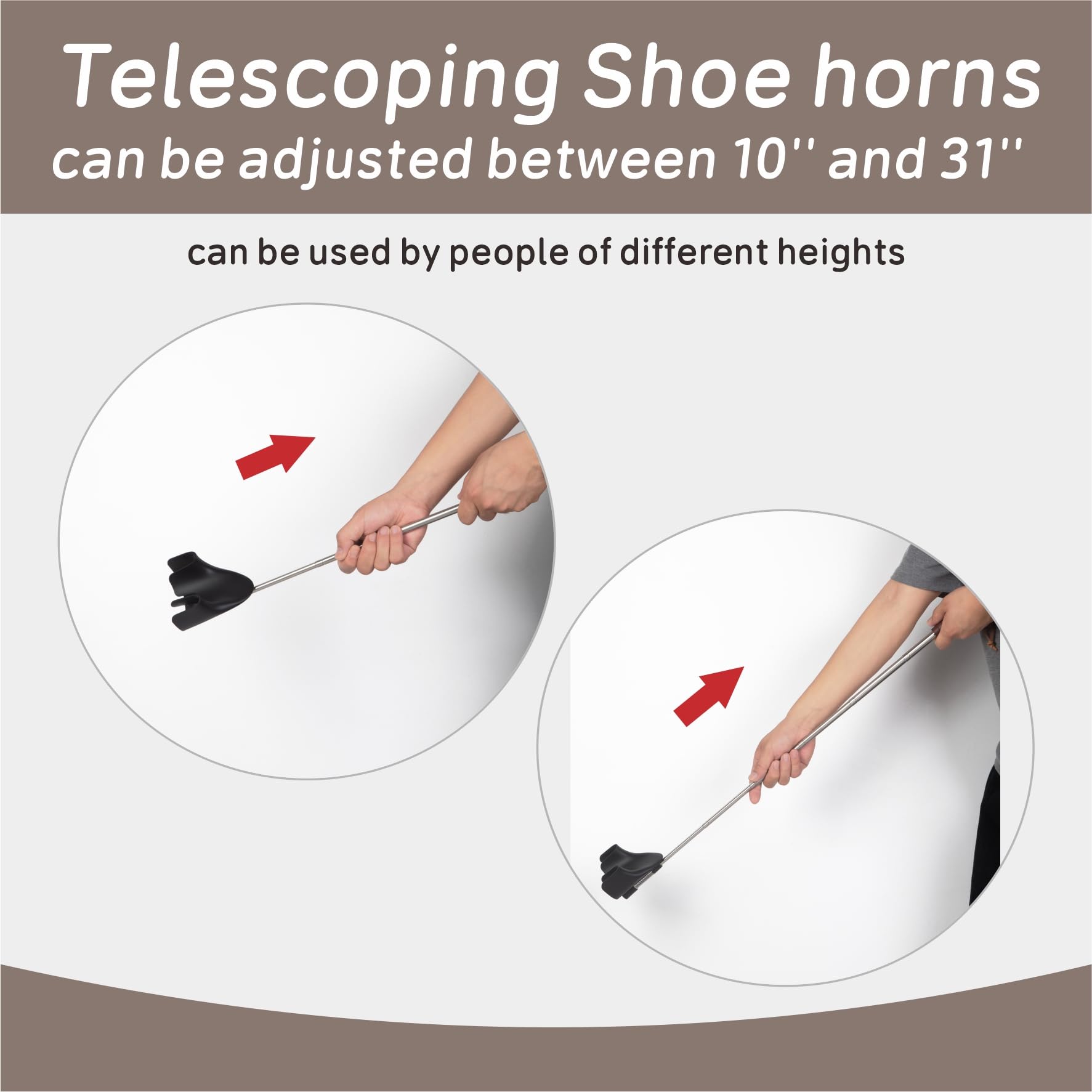 -[No Bending Down Long Shoe Horn]: Our extra long handle shoe horn can be freely adjusted in length.Our shoehorn is work well whether sitting or standing. Especially helpful for people who suffer from back or knee pain and cannot bend down.(Even though you are healthy, sometimes you will still stand and wear shoes.)