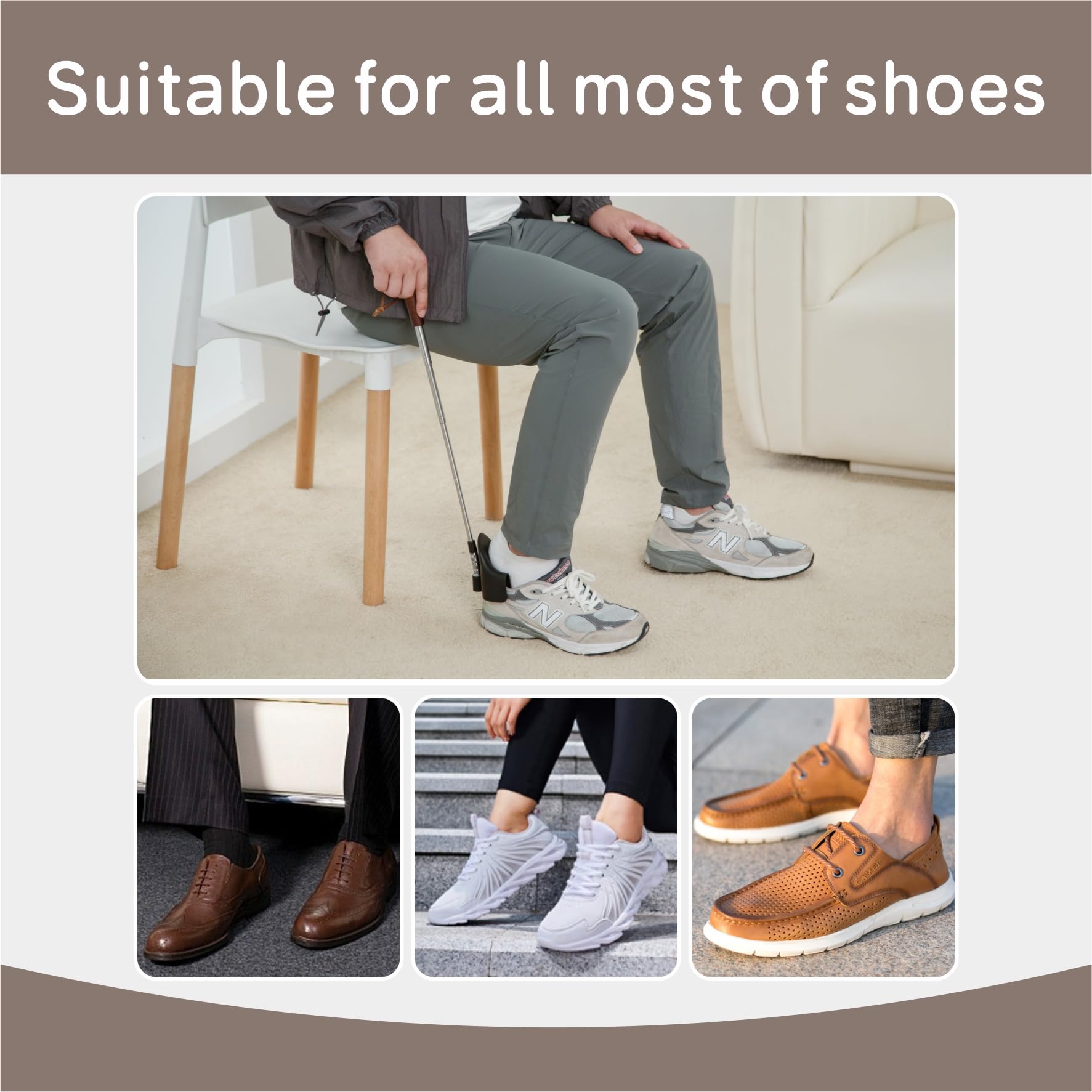 -[Essential for Family Shoehorn Tool]: Dad's leather shoes, Mom's sports shoes, Grandpa's casual shoes, Grandma's flat shoes, Sister's running shoes, Brother's hiking shoes. Whether at home or traveling, our shoehorn long-handle is very suitable for the whole family to use together.