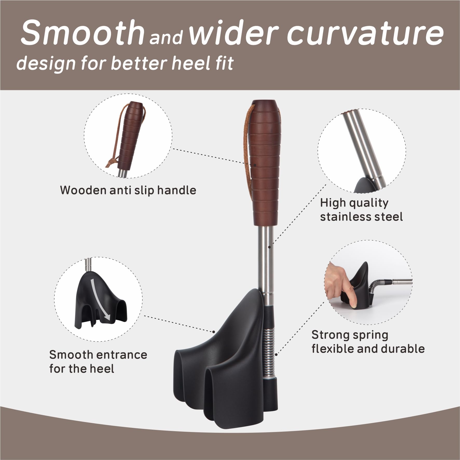-[Flexible and Durable Shoe Horn]: The long shoe horn is made of wood anti slip handles, stainless steel metal rods, bendable springs, and ABS plastic shoe funnel, making it comfortable and durable. The soft spring can adjust its orientation at any angle according to actual needs.