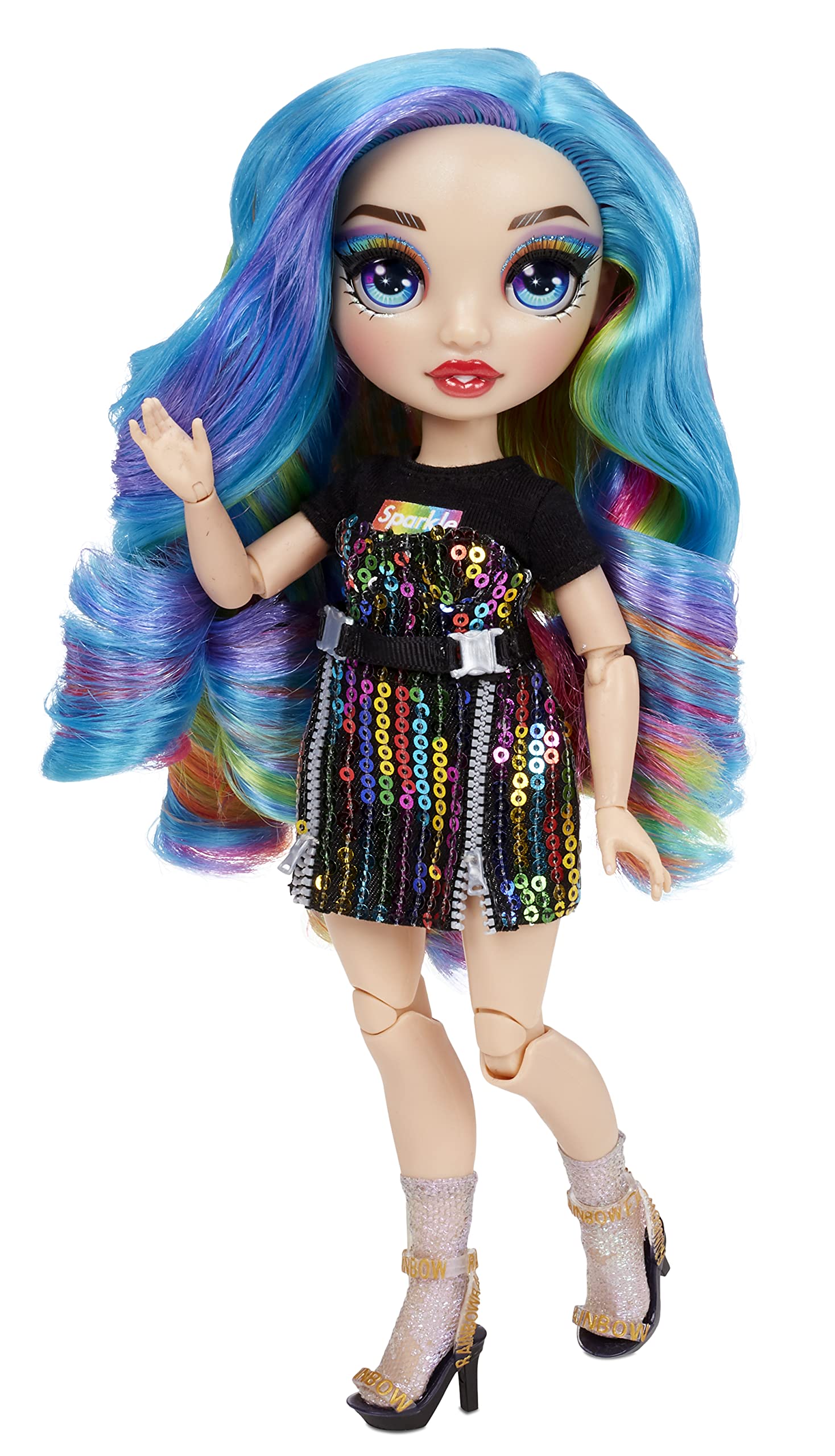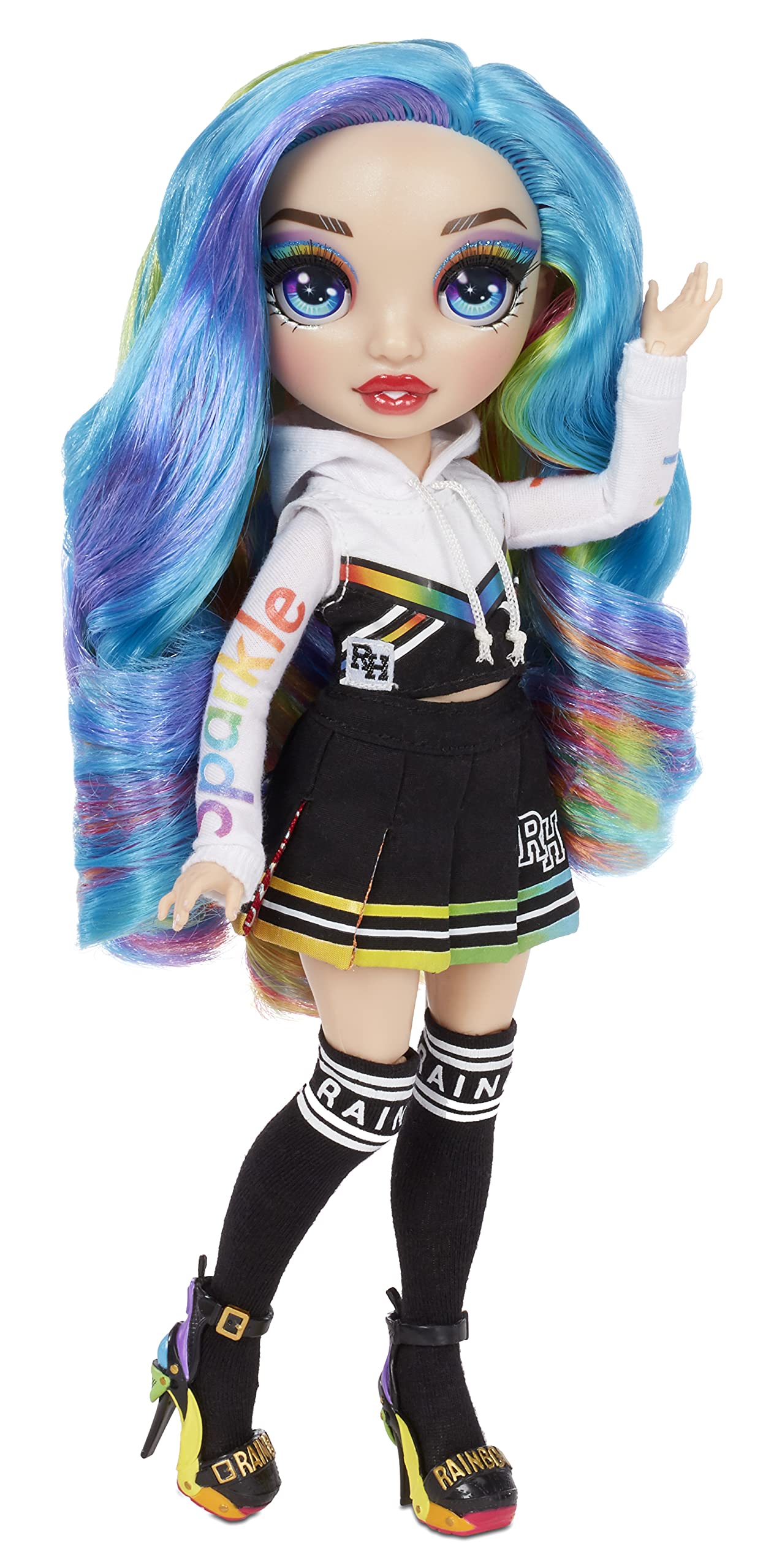 Legend says at the end of the rainbow, there’s a pot of gold. But the truth is, it’s something even more amazing. Only a chosen few with an eye for bold fashions can follow the rainbow to Rainbow High, the colorful fashion school where everyone learns to flaunt their true colors. Collect the Rainbow of beautiful fashion dolls with Rainbow High. Amaya Raine has returned with a rainbow hair makeover and all new fashions. She's dressed in rainbow from head to toe, and she has gorgeous features, long eyelashes and beautiful, brushable hair. She's fully articulated and posable. Her arms and legs bend, so she can strike tons of glamorous poses. Amaya comes with 2 complete outfits to mix and match for bold, showstopping looks. Amaya has a statement making style that's anything but traditional. Dress her in her cheerleading outfit, hoodie, shirt and skirt, t-shirt, 2 pairs of heels and more. Also includes hair comb, two hangers and a doll stand. PRO TIP: When first unboxing doll, wash her hair thoroughly to remove styling gel and let hair dry completely. Then, her hair is ready to brush. Collect them all. Krystal Bailey, Amaya Raine, Stella Monroe, Bella Parker, Karma Nichols, River Kendall. How to Wash Your Rainbow High Doll's Hair 1. To keep your doll's clothes from getting wet, either remove them or cover clothes with a towel. 2. Wet your doll's hair completely with water. 3. Lather in a little shampoo or dish soap to wash out any product or residue. 4. Optional: To soften hair even more, add a bit of conditioner, work in with fingers or comb through hair, then rinse out. 5. Let hair air dry completely. 6. Hair is ready to brush & style. Rainbow High is a doll collection from MGA Entertainment, makers of your other favorite brands like LOL OMG Surprise dolls, LOL Surprise Remix, Na Na Na Surprise and Poopsie Slime Surprise.