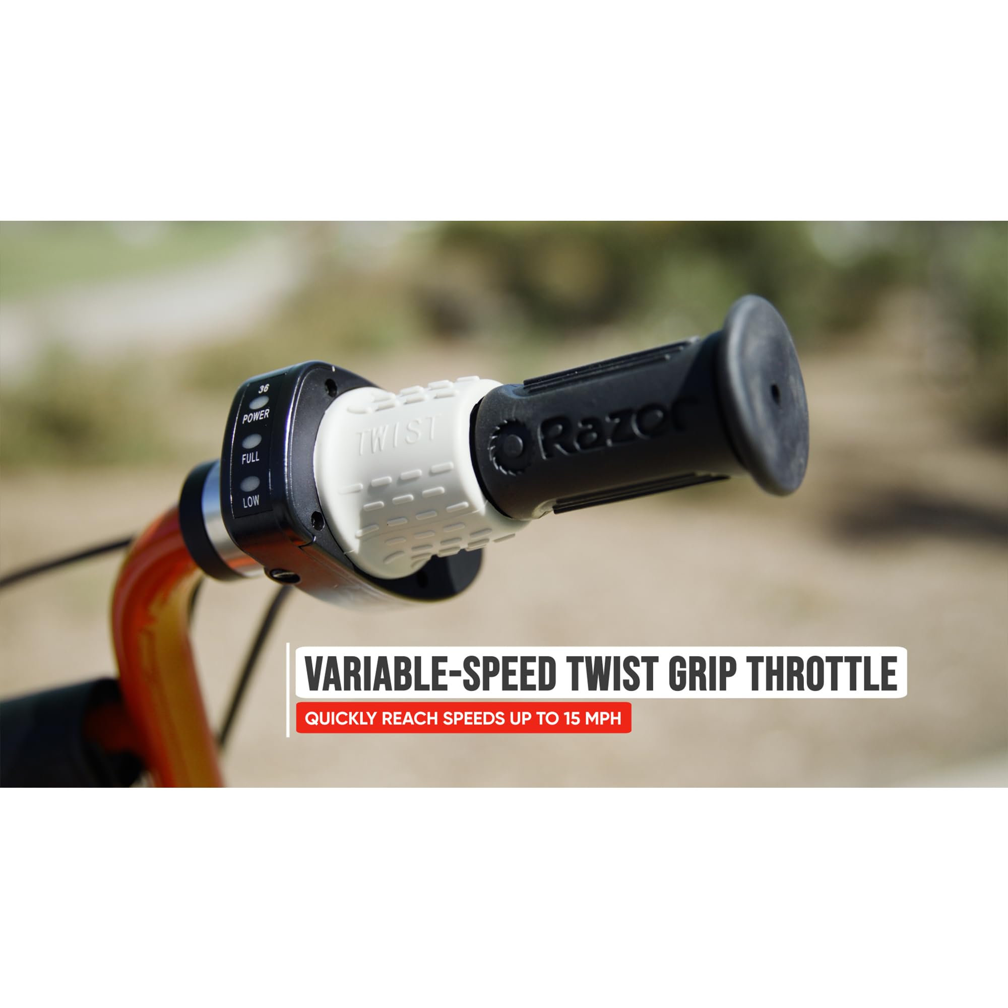 Amazon.com Essentially a scaled-down motocross bike with an electric motor, the Razor MX500 Dirt Rocket is ideal for teens who want to enjoy the dirt bike experience without breaking the bank. The Dirt Rocket's powerful 500-watt motor carries riders at speeds of up to 17 miles per hour--more than enough for most bumpy dirt trails--and can cruise for up to 10 miles on a single charge. At the same time, the bike's dual suspension and riser handlebars deliver a smooth and comfortable ride regardless of the terrain, so your teen's fun isn't restricted to flat pavement. As a final bonus, the Dirt Rocket's variable-speed, chain-driven motor is extremely quiet, a marked contrast to traditional gas-powered motocross bikes. Other details include large pneumatic knobby tires for a maximum power transfer, authentic dirt bike frame geometry, a retractable kickstand, and a double-crown fork. The MX500, which requires roughly eight hours to fully charge, is recommended for ages 14 and over and offers a maximum weight limit of 175 pounds. It's also backed by a 90-day warranty. Product Description Unleash your inner motocross champion with the Razor MX500 Dirt Rocket Electric Bike! Designed for riders 14 and up, this powerful electric bike delivers speeds up to 15 mph (24 km/h), making it perfect for thrill-seekers and outdoor enthusiasts alike. Imagine zipping through trails and conquering rough terrain with ease, thanks to its durable steel frame, dual suspension system, and large pneumatic knobby tires that ensure a smooth and comfortable ride. Built to withstand the demands of off-road riding, this bike features a high-torque, chain-driven motor for quiet yet powerful operation. Hand-operated dual disc brakes provide precise control and safety in any situation. The rechargeable 36V (three 12V) battery (charger included) offers up to 40 minutes of continuous ride time, allowing plenty of opportunity to explore and enjoy the great outdoors. With a weight capacity of up to 175 lbs, the MX500 accommodates a wide range of riders seeking the thrill of motocross. Adjustable riser handlebars and soft rubber grips ensure a comfortable riding position, promoting control during long rides. The bike's authentic motocross frame geometry and shatter-resistant plastic fairings enhance durability while giving it a sleek, sporty appearance that turns heads wherever you go. Whether navigating dirt paths or cruising around the neighborhood, it blends functionality with eye-catching design for an unforgettable riding experience. Whether you're a seasoned rider or just starting out, this dirt bike promises endless excitement and adventure. Discover why Razor continues to be a trusted name in outdoor electric vehicles and elevate your riding experience with the MX500 Dirt Rocket.