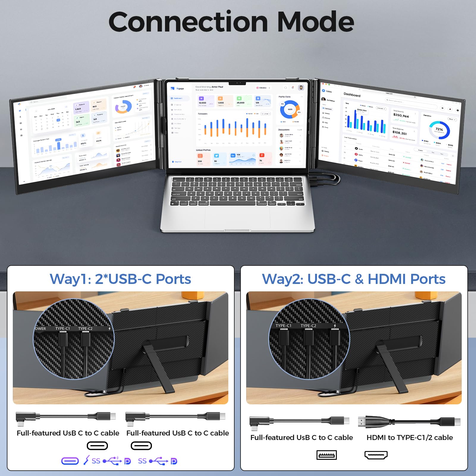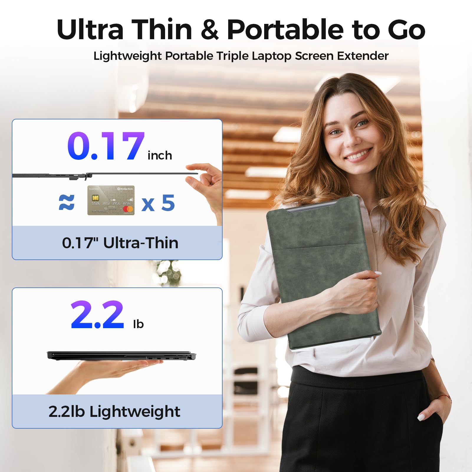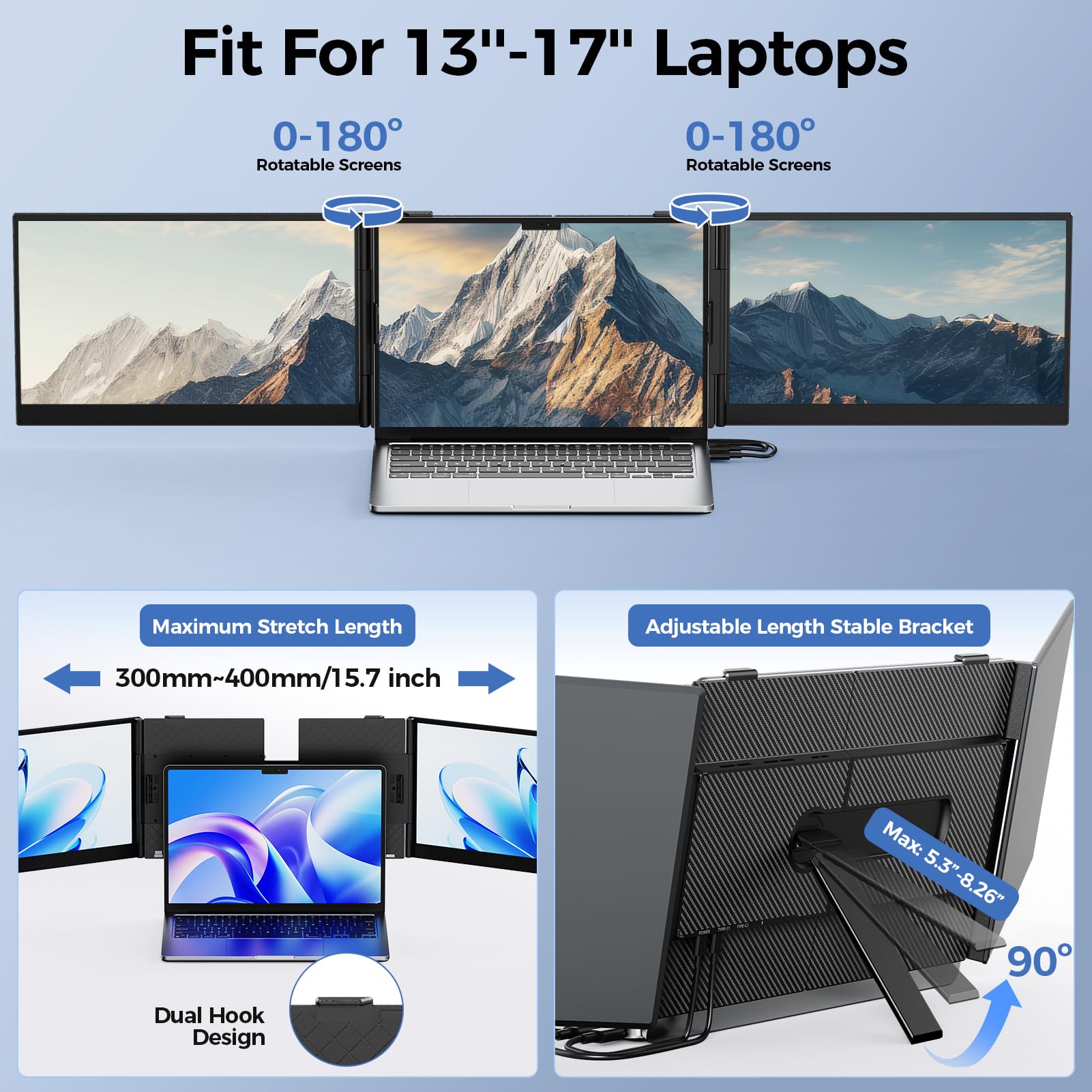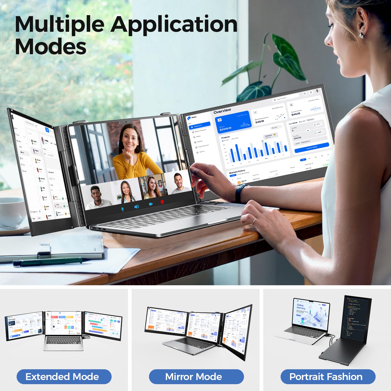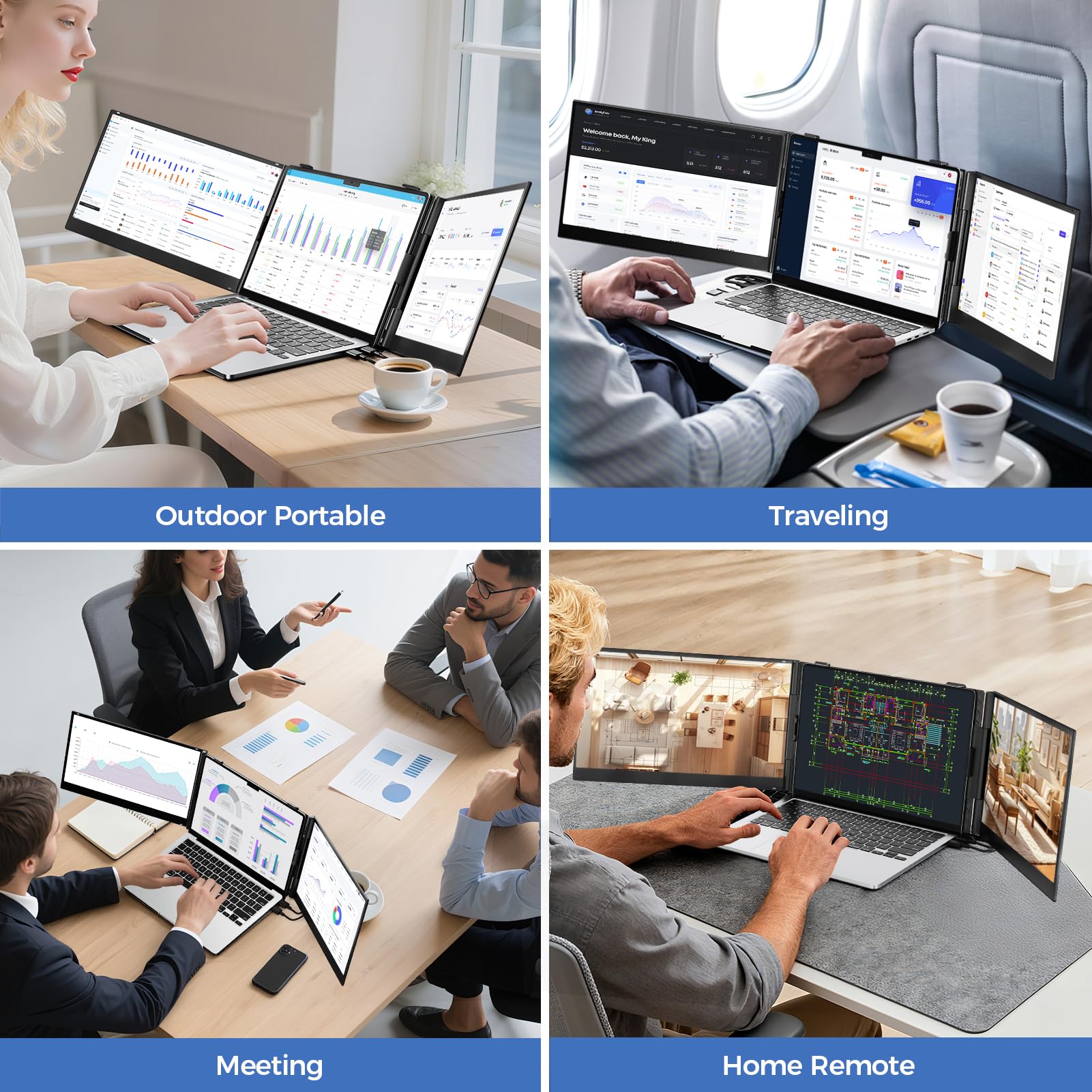 -【Triple-Screen Productivity Boost】Designed as a powerful triple portable monitor, the laptop monitor extender lets you expand, mirror, or rotate screens to handle multiple tasks at once. Perfect for multitasking, video calls, trading, design work, and gaming, it can boost productivity by up to 300%.