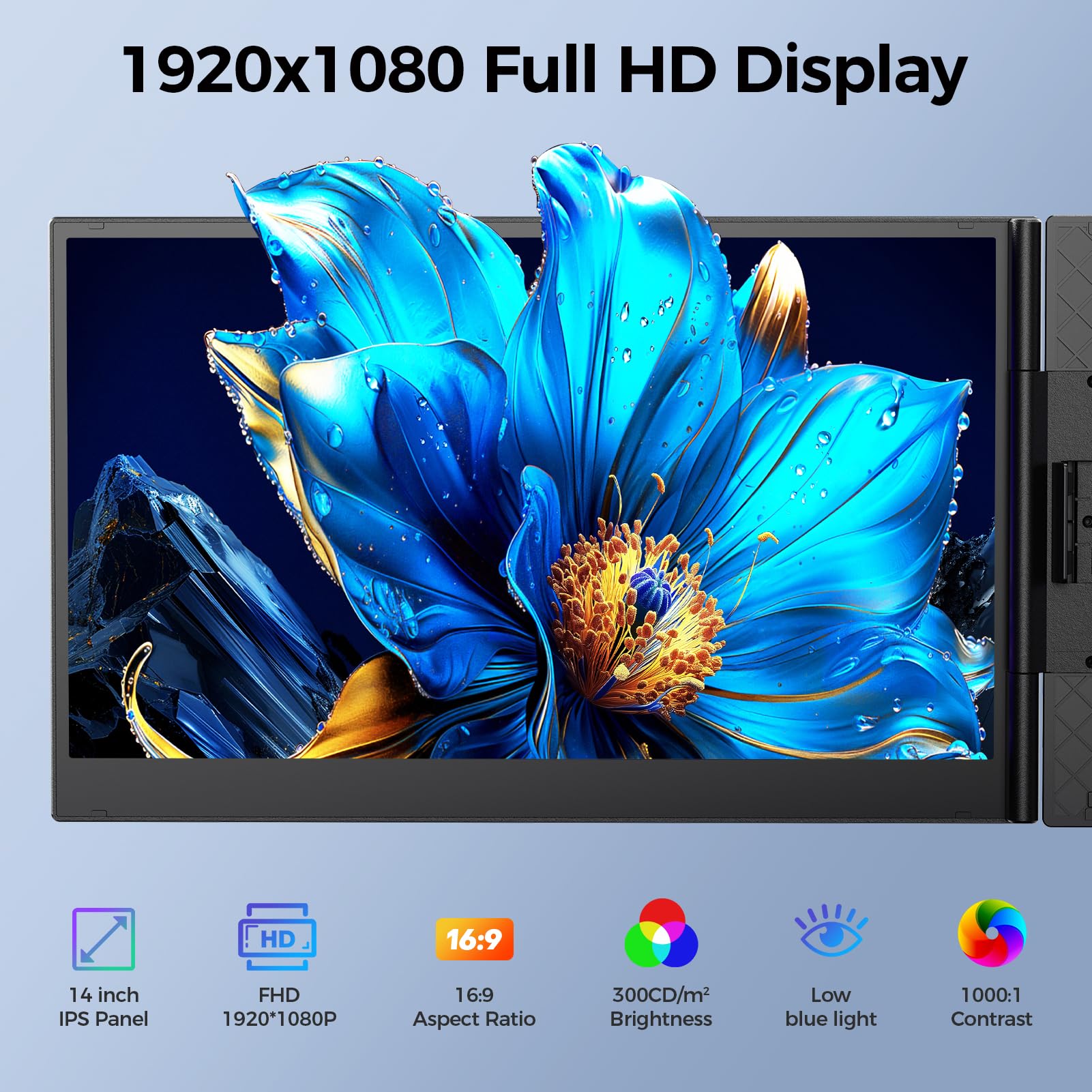 -【Vivid 14” FHD IPS Display】Enjoy sharp, vibrant visuals with a 1920×1080 FHD IPS panel, wide 178° viewing angles, anti-glare coating, and eye-care technology. This portable monitor for laptop delivers consistent colors, smooth brightness control, and immersive viewing for work and entertainment.