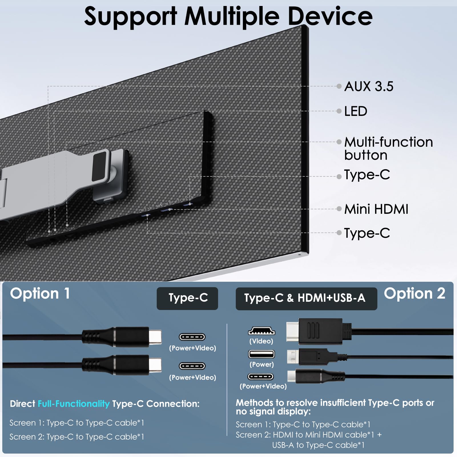 -Plug and Play - The Portable monitor for laptop provides 2 full-function Type-C ports and 1 mini HDMI port to connect most devices. Only Two Type-C cable is needed to connect the external display to computer, and it supports power pass-through reverse charging. Note: Your device should support Thunderbolt 3.0/4.0 or USB 3.1 Type-C DP ALT-MODE. If not, you can connect via HDMI and power cable.