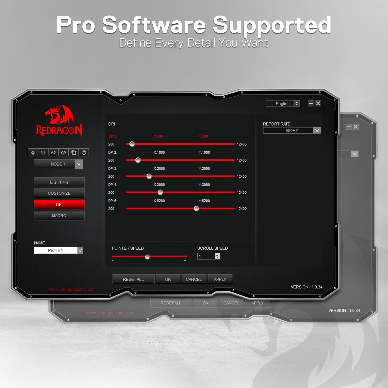 -Professional Gaming Mouse - Redragon M908 optical gaming mouse is designed with up to 12400 DPI, 5 adjustable DPI levels (500/1000/2000/3000/6200 DPI) meet your multiple needs, either for daily work or gaming. DPI can be adjusted freely by ±100 from 200 to 12400 via software. 1000 Hz polling rate, 30G acceleration and high-precision Pixart PAW3327 Sensor giving you a greater edge over your competition.