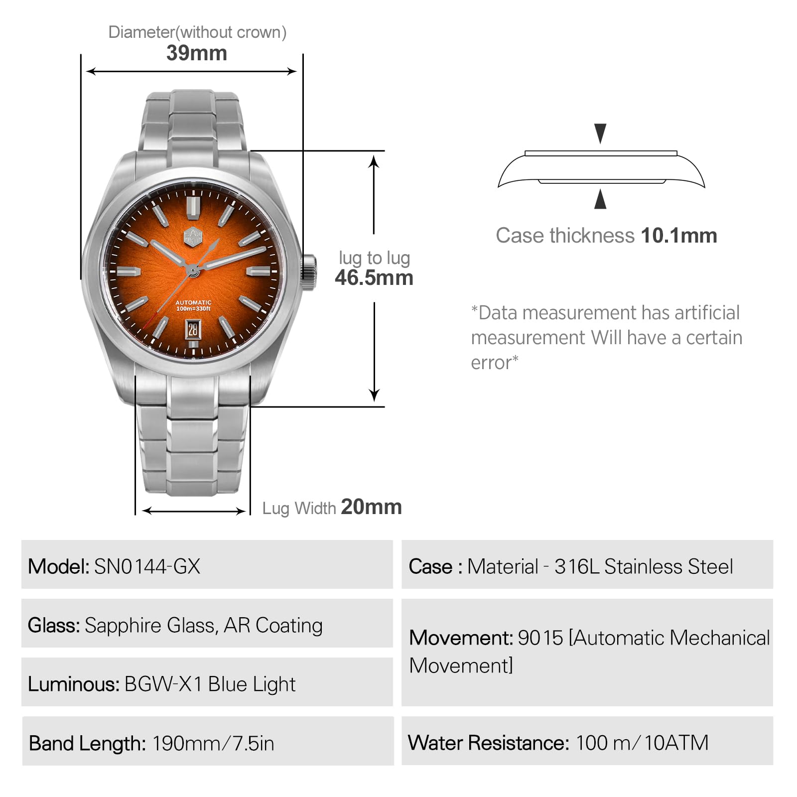 -Watch Dimension: Case Diameter: 39 mm; Lug to Lug: 46.5 mm; Thickness: 10.1 mm; Band Length: 190 mm/7.5 in; Band width: 20 mm