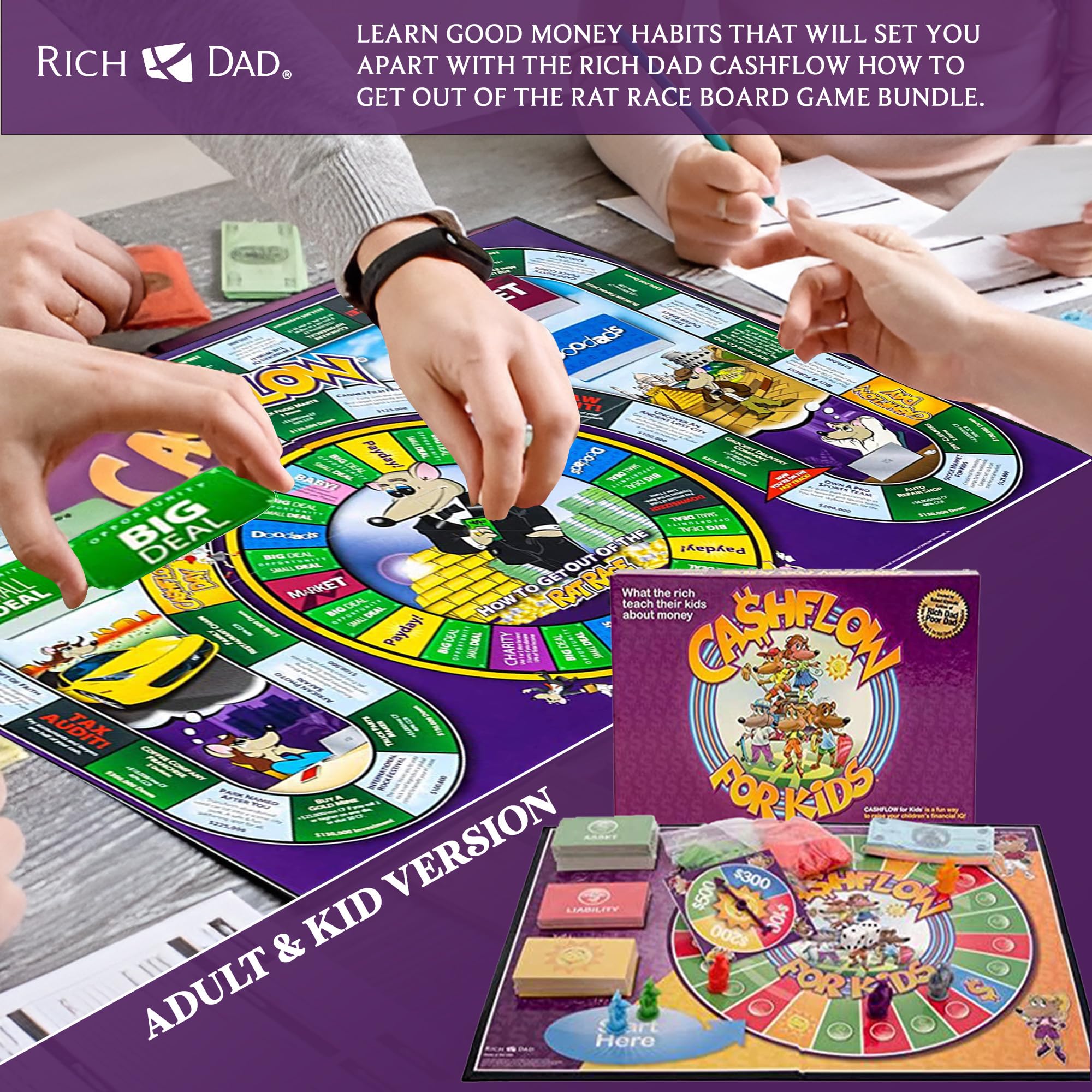 Rich Dad Cashflow Cómo salir de la carrera de ratas Juego de mesa, versión para adultos y niños: juegos de aprendizaje de alfabetización financiera divertidos y educativos para niños, niñas y familias