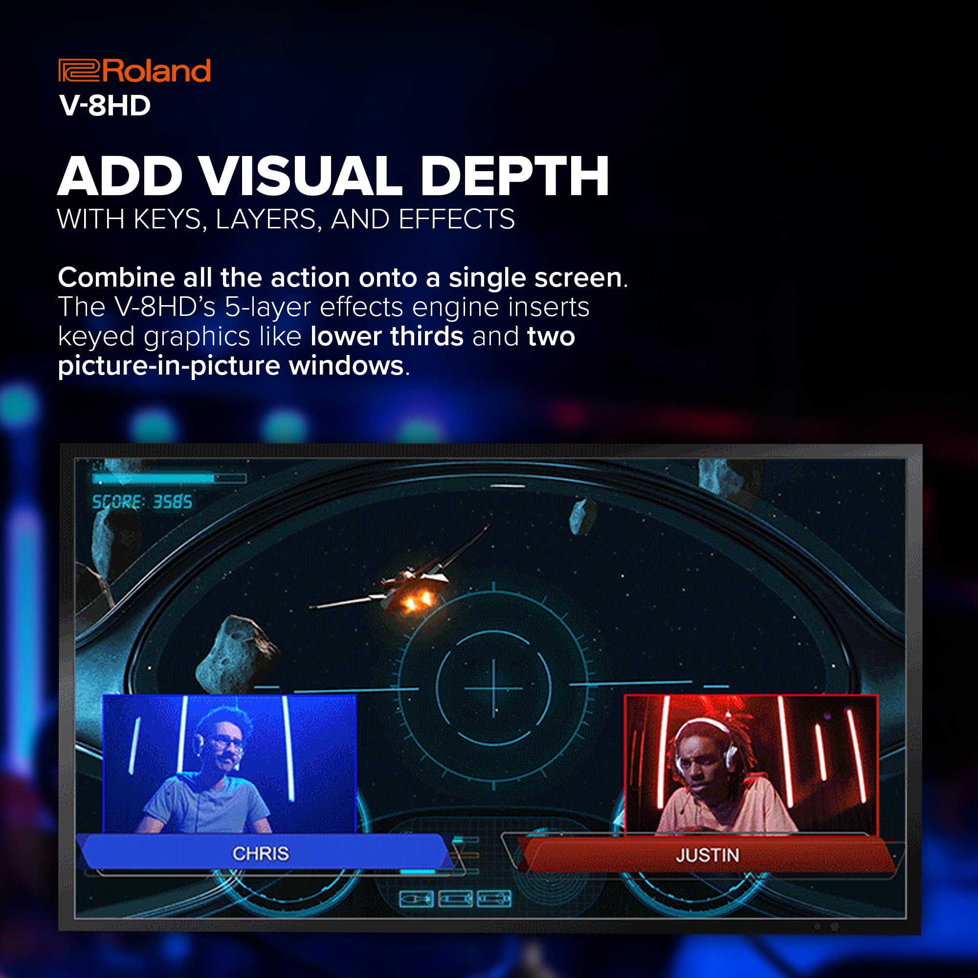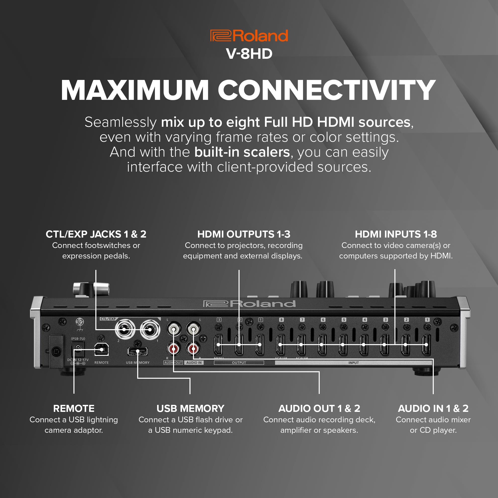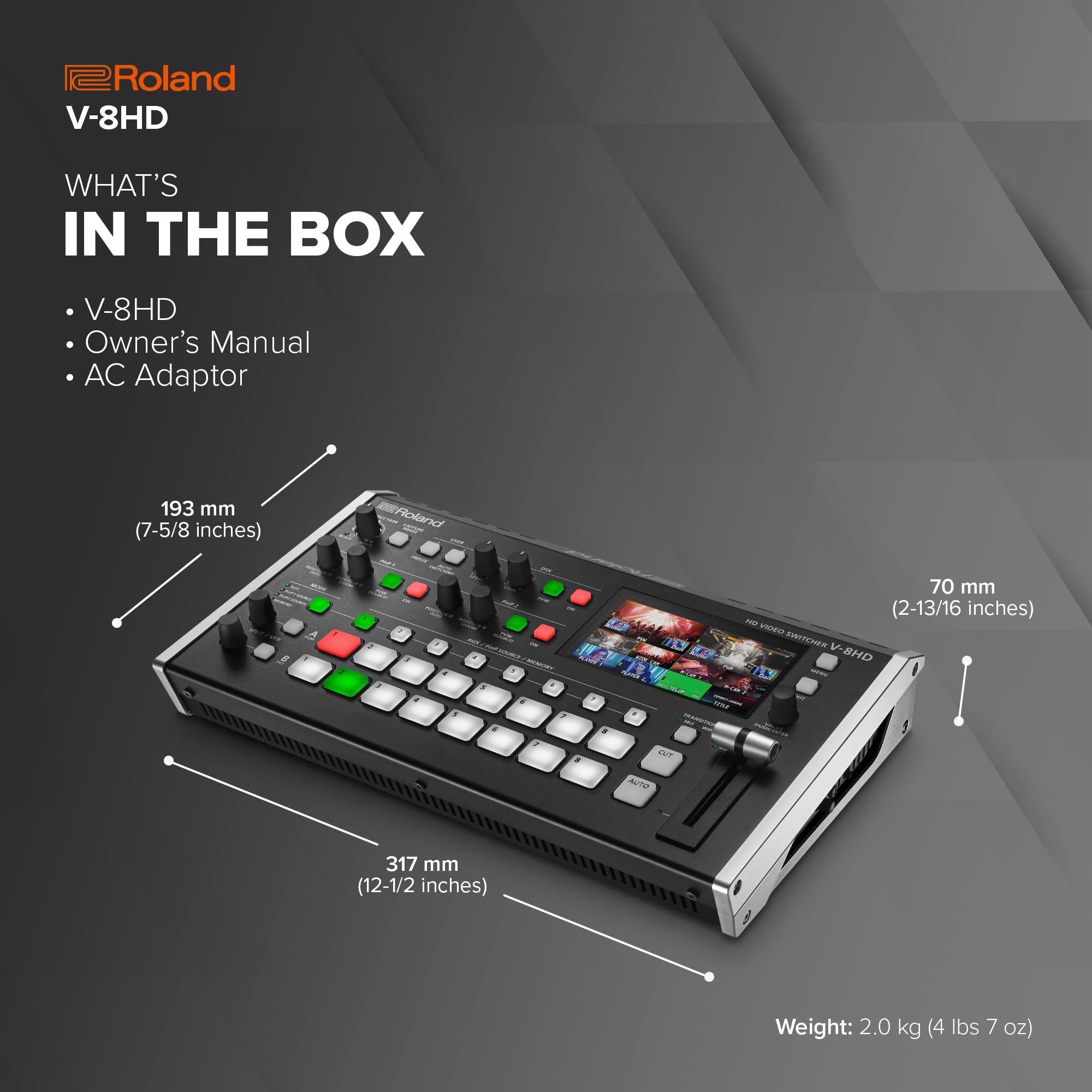 Roland V-8HD | Conmutador de vídeo HD para eventos en vivo, streaming y presentaciones corporativas | Mezcla 8 fuentes HDMI | Efectos de 5 capas y motor de codificación | Pantalla multivisor incorporada