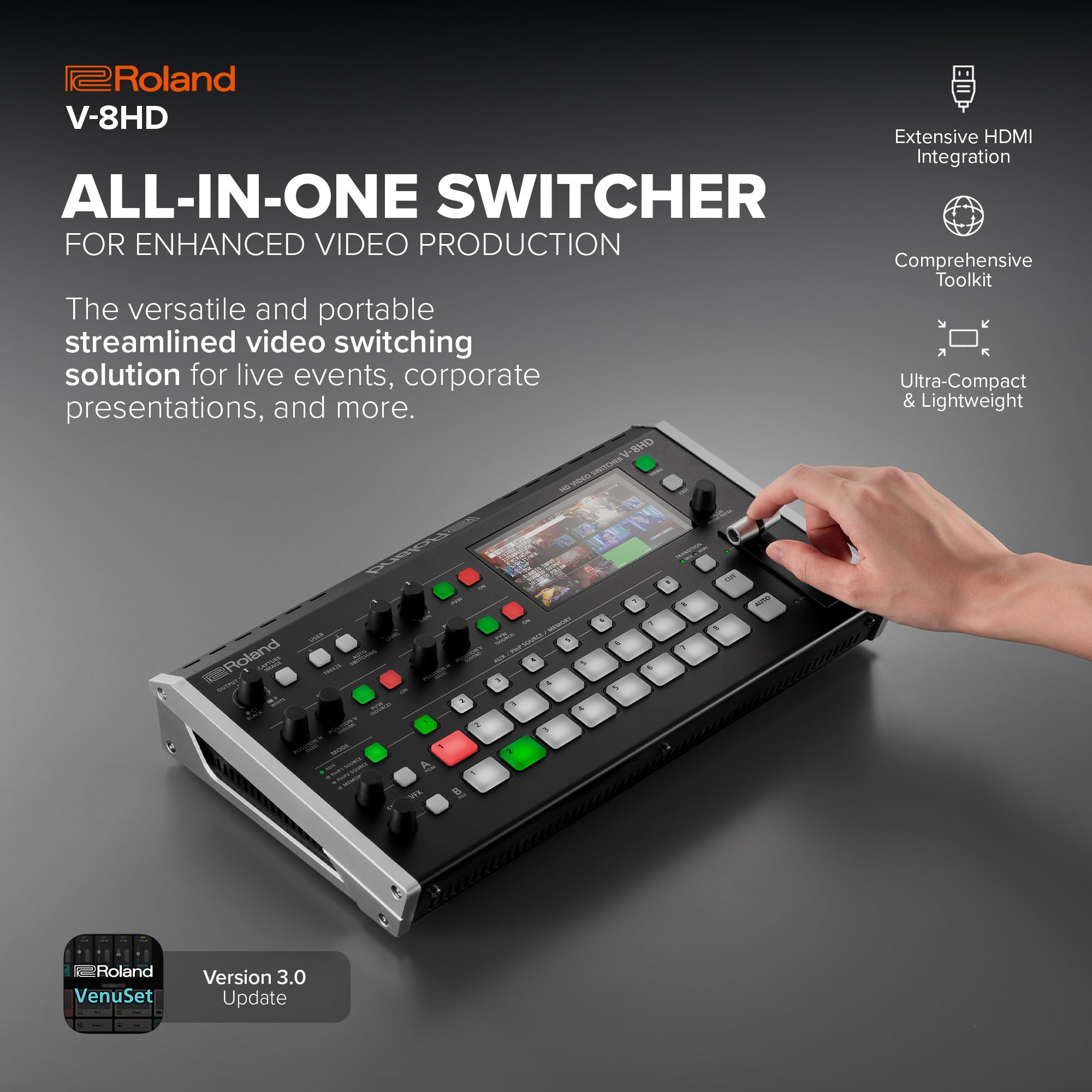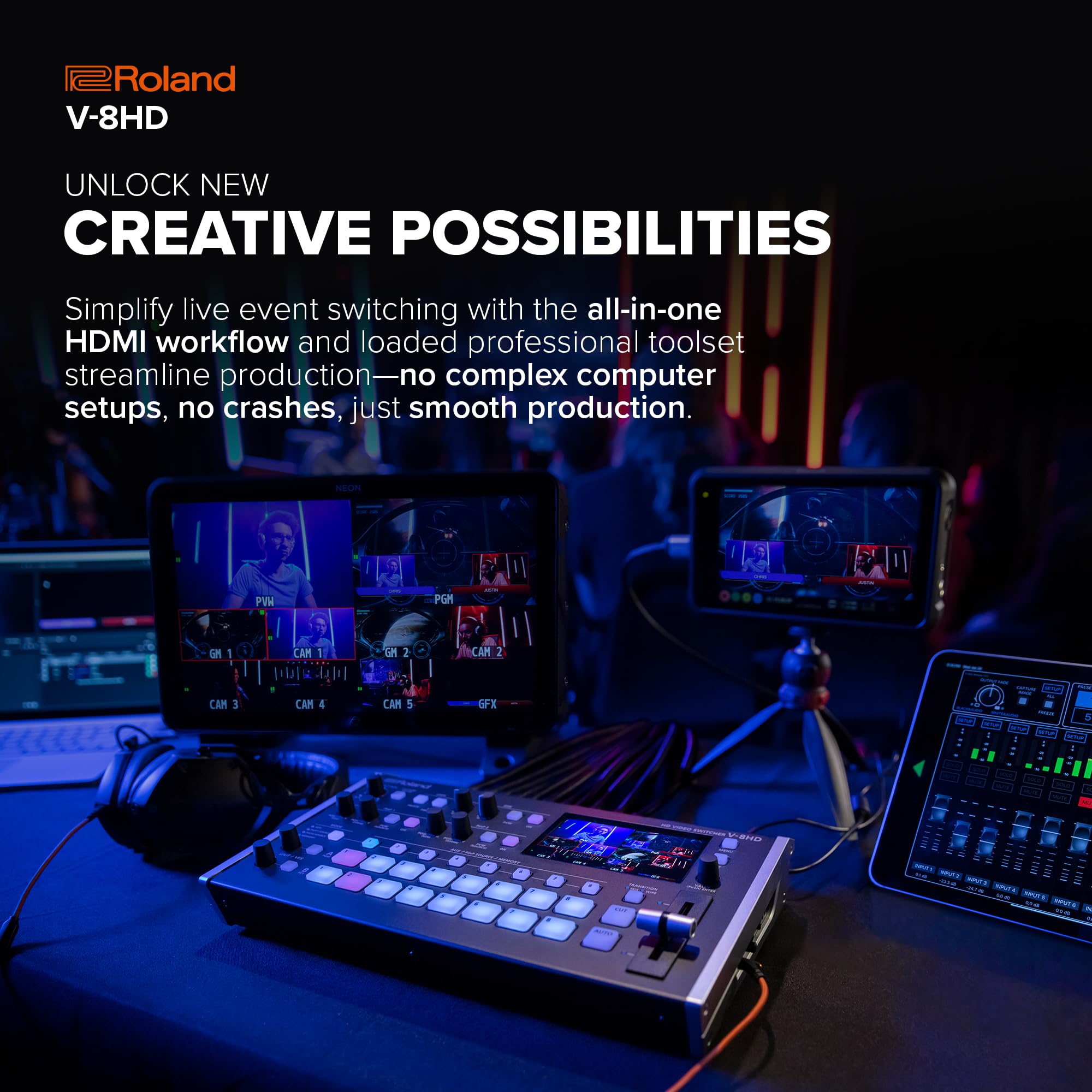 Versatile, portable, and reliable, the Roland V-8HD brings a world of creative options to live event switching. Its all-in-one hardware design eliminates computer setup hassles and software-based crashes, while the HDMI workflow and loaded professional toolset streamline production and reduce stress on the gig.