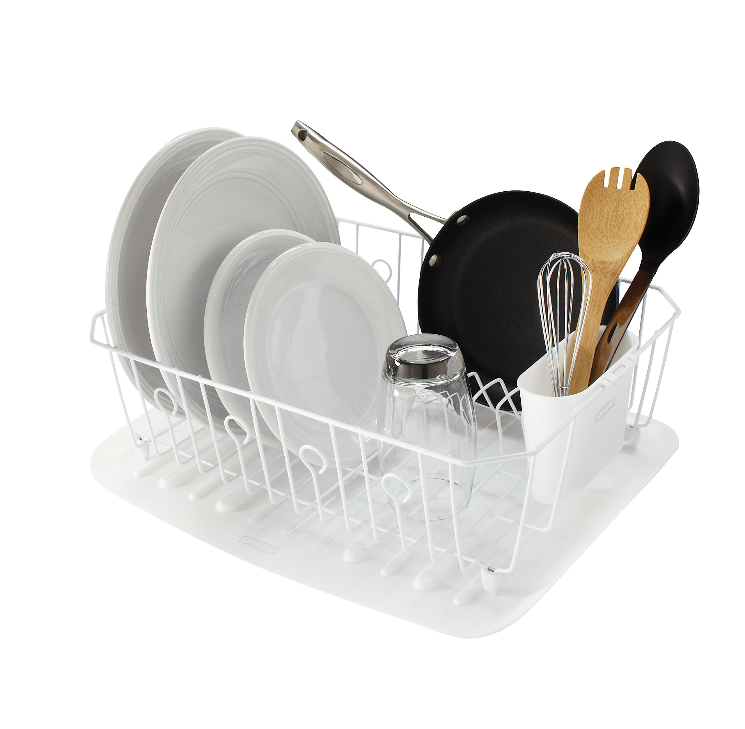 Drainer fits into most sinks to neatly organize your dishes for drying after they have been washed. Holds up to 13 plates and 6 glasses with angled plate holders to separate china for quick drainage. Built-in Microban antimicrobial protection fights the growth of stain- and odor-causing bacteria to keep your rack and dishes looking and smelling fresh. 1-piece plastic-coated wire construction is sturdy to hold stoneware plates securely, but cushions and protects dishes and sinks from scratches. Made in China . Rubbermaid AntiMicrobial In-Sink Dish Drainer, White, Large (FG6032ARWHT).