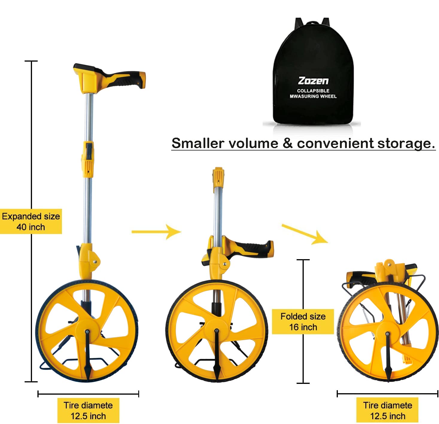 Rueda de medición Zozen con pantalla digital, plegable de 3 secciones, rueda de medición imperial/métrica con pantalla retroiluminada | Hasta 99,999 pies/99,999 m | Soporte para mantener el soporte | Portátil, incluye mochila de tela.