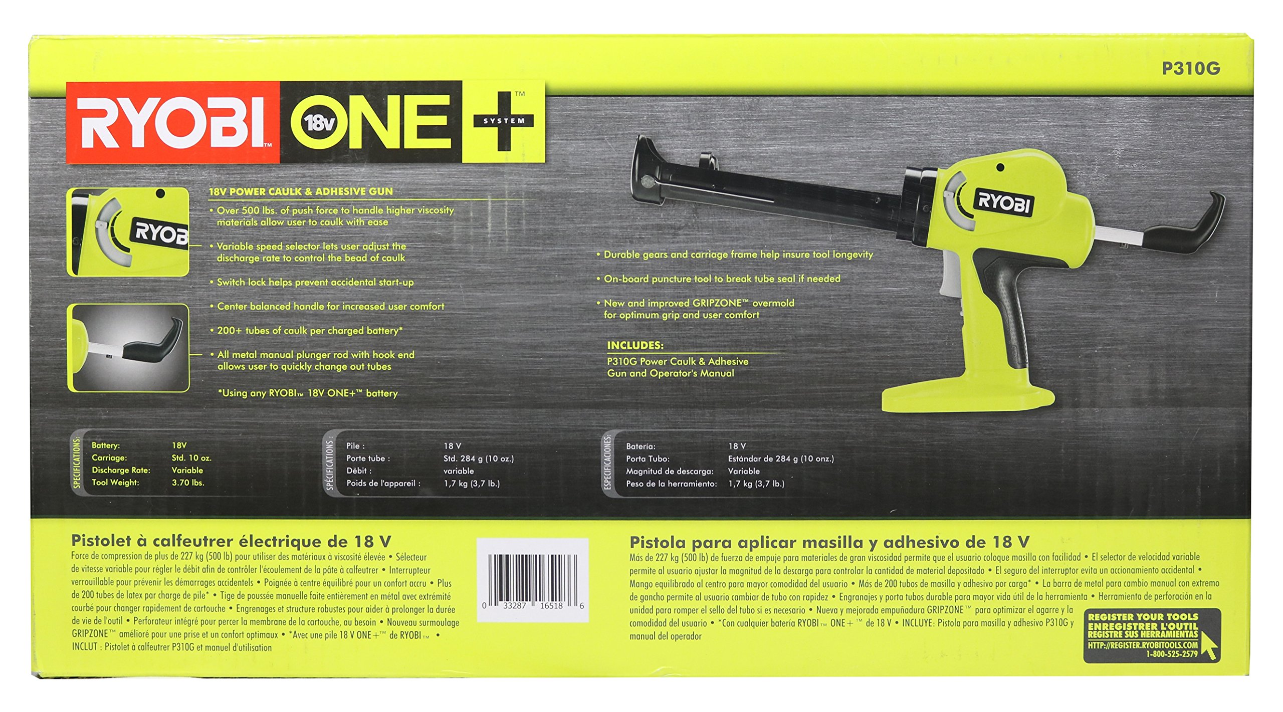 Over 500 Lbs. Of Push Force To Handle All Caulking Jobs Variable Speed Selector Allows You To Best Control The Caulk Over 225 ONE+ Tools – All Work With Any RYOBI ONE+ 18V Battery RYOBI introduces the 18V ONE+ Power Caulk and Adhesive Gun. This tool features over 500 lbs. of push force to handle higher viscosity material with ease and can apply more than 200 tubes of caulk per charged ONE+ battery. Best of all, it is part of the RYOBI ONE+ System of over 225 Cordless Tools that all work on the same battery platform. The 18V ONE+ Power Caulk and Adhesive Gun is backed by the RYOBI 3-Year Manufacturer's Warranty and includes an operator's manual. Battery and charger sold separately.