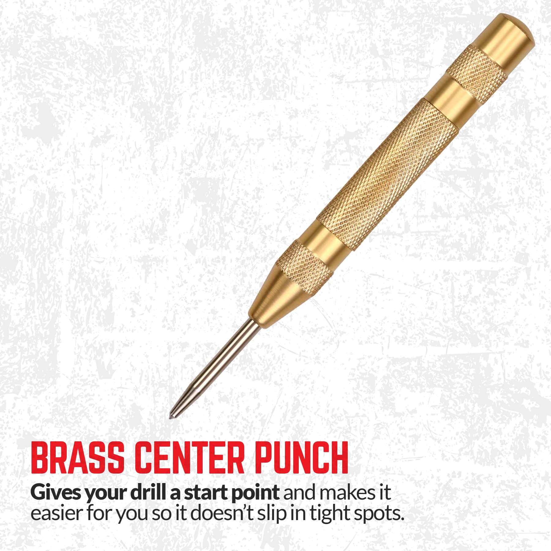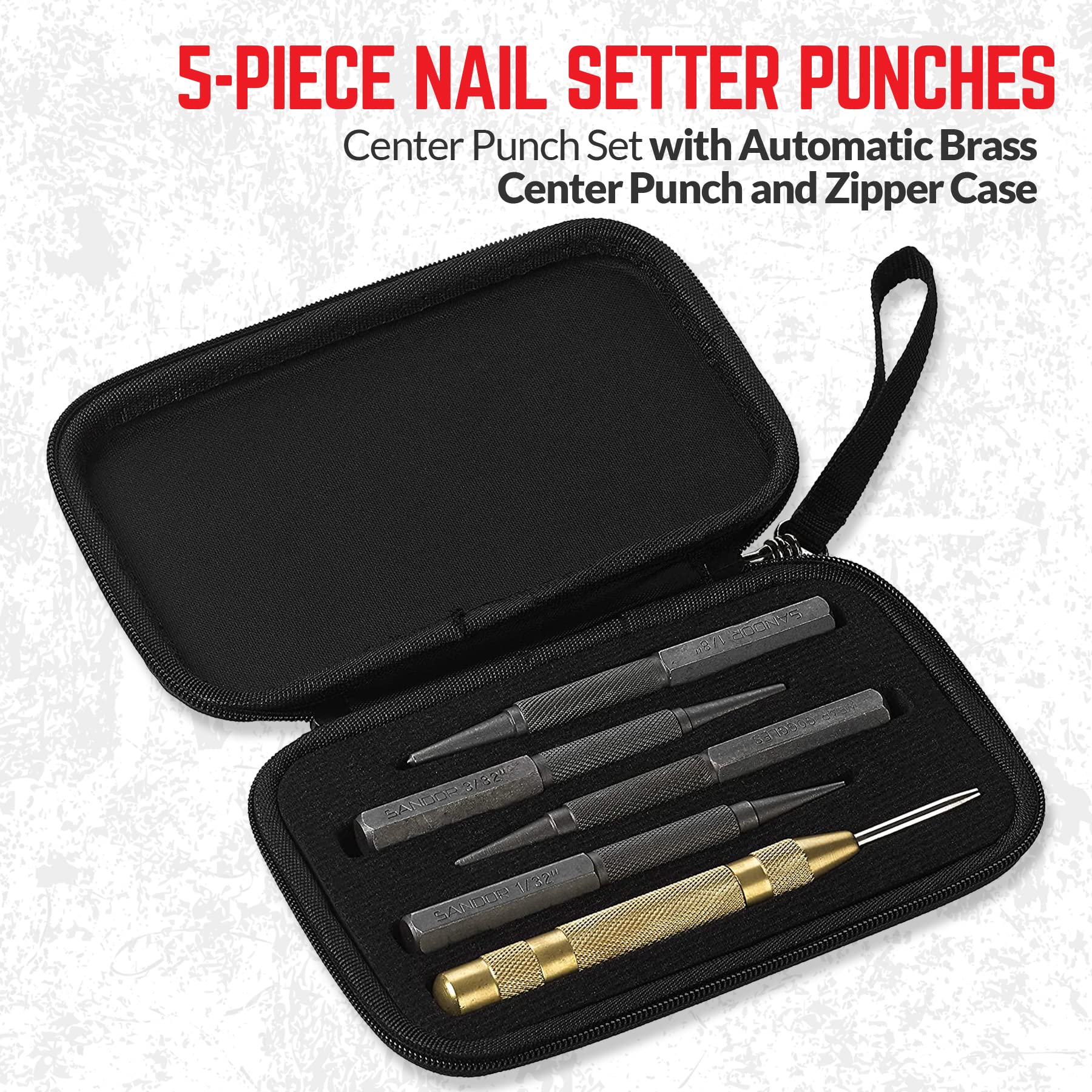 5-Piece Nail Setter Punch and Center Punch Set with Automatic Brass Center Punch and Zipper Case Don't let your drill walk again! Always give your drill a starting point and makes it easier for you so it doesn’t slip in tight spots. KEY FEATURES: INCLUDES 4 SIZES: 1/32", 1/16", 3/32", 1/8" Center Punches / Nail Setters 1 - Automatic Brass Center Punch Tool Hardened Steel on Both Ends Deep Knurled Grip for Easy Handling Designed for Countersinking Finishing Nails & Setting Nails into Materials Center Punch for Starting Drill Holes - Works on wood, metal, steel, aluminum, brass, copper and more Zipper Storage Case Click "ADD TO CART" to order your 5-Piece Nail Setter Punches and Center Punch Set Today!