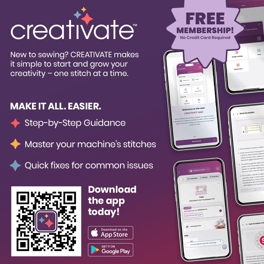 -FREE CREATIVATE App – Your sewing support hub for SINGER! Input your machine model number to access your manual, quick start, tutorials, troubleshooting tips, accessories and more! Download, pick your model & start sewing smarter.