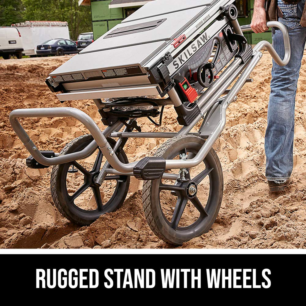 The 10 in. Heavy Duty Worm Drive Table Saw is the latest addition to SKIL’s table-saw lineup. SKIL’s legendary Worm Drive power train delivers superior torque, an aggressive 3-⅝ in. depth of cut, and 30-½ in. rip capacity. Tear through plywood and slice 4x with ease and precision. The rack and pinion system makes fence adjustments quickly and smoothly for accurate cuts. SKIL’s patented Dual-Field™ Motor runs cooler, so it can work harder, longer. The rugged stand delivers dependable stability, and the sixteen-inch wheels easily take stairs and roll over uneven surfaces to just about anywhere you need to set up and let it rip.