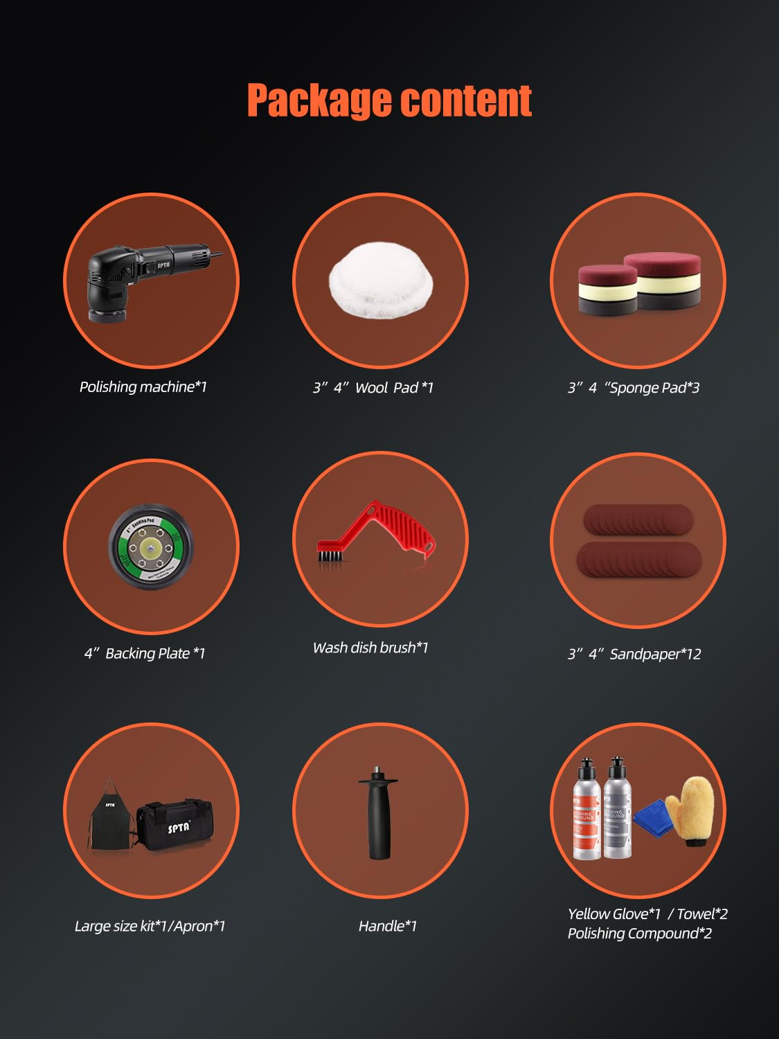 -◇What You Will Have◇ 1PC 3inch 10mm dual cation polisher, 3pcs 3inch&4inch polishing pads,1pc 3inch&4inch wool pads,2 bottles car scratch remover,1pc artificial cleaning glove,2pcs microfiber towel,1pc 4inch backing pad,1pc pad conditioning brush,12pcs 3inch&4inch sanding discs,1pc tool apron 1pc tool bag,1pc handle and our best service.