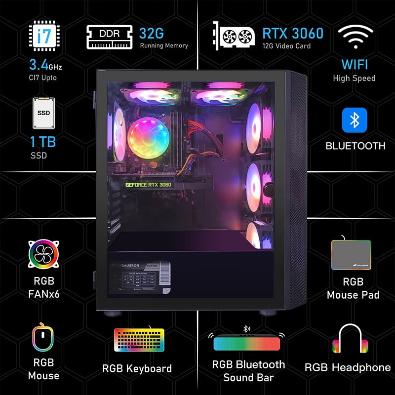 PC de escritorio STGAubron, Intel Core i7 hasta 3.9G, GeForce RTX 3060 12G GDDR6, 32G, 1TB SSD, WiFi, BT 5.0, RGB Fanx6, teclado RGB, mouse RGB, alfombrilla para mouse, barra de sonido Bluetooth RGB, micrófono para juegos RGB BT W1