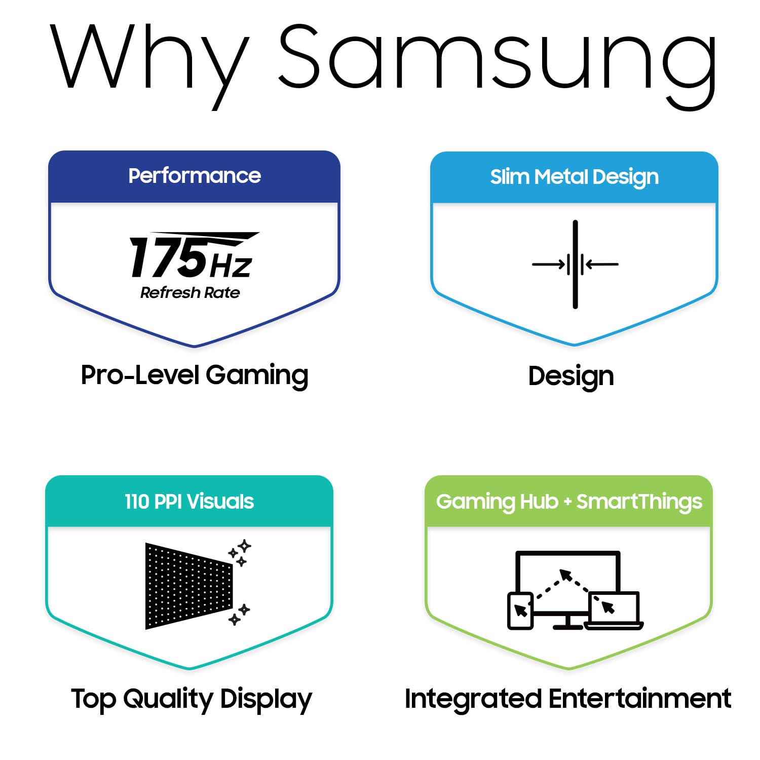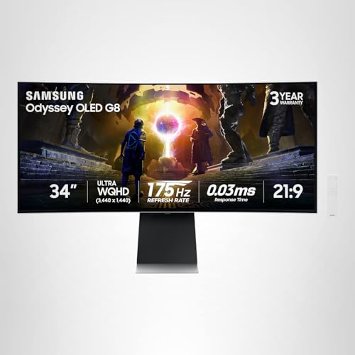 Samsung's 34" Odyssey OLED G8 Ultra-WQHD Gaming Monitor features OLED technology for a wider color spectrum and vibrant images. 175Hz refresh rate, 0.03ms response time (GtG), G-Sync compatible, and AMD FreeSync™ Premium Pro allows for faster, exhilarating gameplay without image tearing. 34" 21:9 Ultra-WQHD display with 110 pixels per inch for stunning detail and clarity. Glare Free technology significantly reduces glare from external light sources, so the OLED screen’s perfect black and color experience are presented without distractions. OLED Safeguard includes Thermal Modulation System, Logo and Taskbar Detection & Screen Saver to help prevent burn-in. A Slim Metal Design and Ergonomic Stand provide unparalleled style and comfort, with connectivity that enables access to a variety of input options. Gaming Hub offers instant access to streaming with Smart TV Apps for access to must-see shows and free live content. ¹Based on GtG measured under internal test conditions. Results may vary by content and monitor settings. GtG (Gray to Gray) measures the time taken for a monitor pixel to change from one gray value to another. Refresh rate and response time may vary based on the performance of the input source. ²Images simulated for illustrative purposes. ³Based on internal test results. ⁴When "Adjust Logo Brightness" setting is on "Off" or "Low," Thermal Modulation is active in preset picture modes only. When "Adjust Logo Brightness" setting is on "High," Thermal Modulation is always active. ⁵Logo detection is not available in PC mode. ⁶Screen images simulated for illustrative purposes. 7Screen images simulated for illustrative purposes. The application of the G-Sync logo on the package and product may vary depending on the time of purchase. 8Screen images simulated for illustrative purposes. To use the Dynamic Black Equalizer, Game Mode must be activated in settings.
