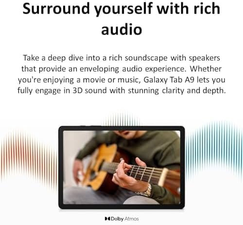 Expansive, bright visuals with smooth motion - Experience the joy of entertainment on the large, bright display. Galaxy Tab A9's 60Hz screen refresh rate lets you immerse in the visuals with smooth and fluid motion. Even when you are out in the sun, step into the captivating world of your favorite content. Store more of what you love - Galaxy Tab A9 come with up to 4GB of RAM memory, ensuring less lag while you multi-task. Plus, the built-in 64GB storage saves all your hi-res videos, photos and files. You can expand the storage with a microSD card — up to 1TB. Store more of what you love and delete less. Split the screen into two. Multiply your productivity - Conquer multiple tasks at once. With Galaxy Tab A9, you can sketch out architectural plans and choose captivating visuals and video chat — up to two apps all on one screen without ever closing a window. Surround yourself with rich audio - Take a deep dive into a rich soundscape with speakers that provide an enveloping audio experience. Whether you're enjoying a movie or music, Galaxy Tab A9+ lets you fully engage in 3D sound with stunning clarity and depth. Galaxy Tab A9 includes Dual Speakers (1.0W) Never lose track - Continue Apps on other devices - Pick up right where you left off, whenever you need. By simply being signed in to the same Samsung account, you can get back to your notes or internet search without starting all over again while freely switching between your two devices. Quick Share at hyperspeed - Sharing your photos, videos and documents is fast and easy with Quick Share. Just a few taps and you can instantly send files from your Galaxy phone, Tab or Book to other nearby Galaxy devices — even to multiple devices. Want to send a file to a non-Galaxy device? It's as easy as sending a link.