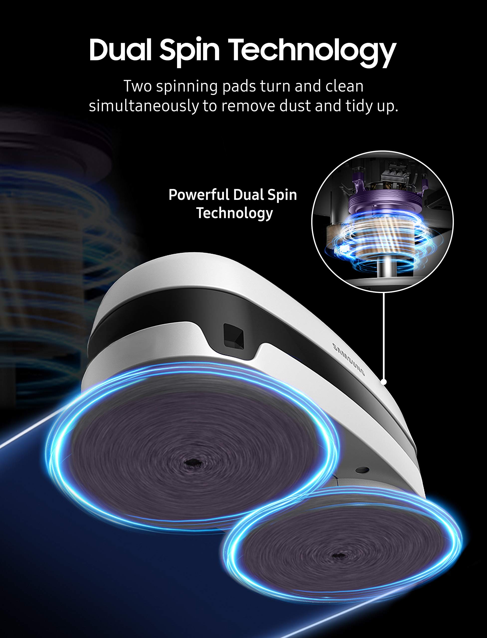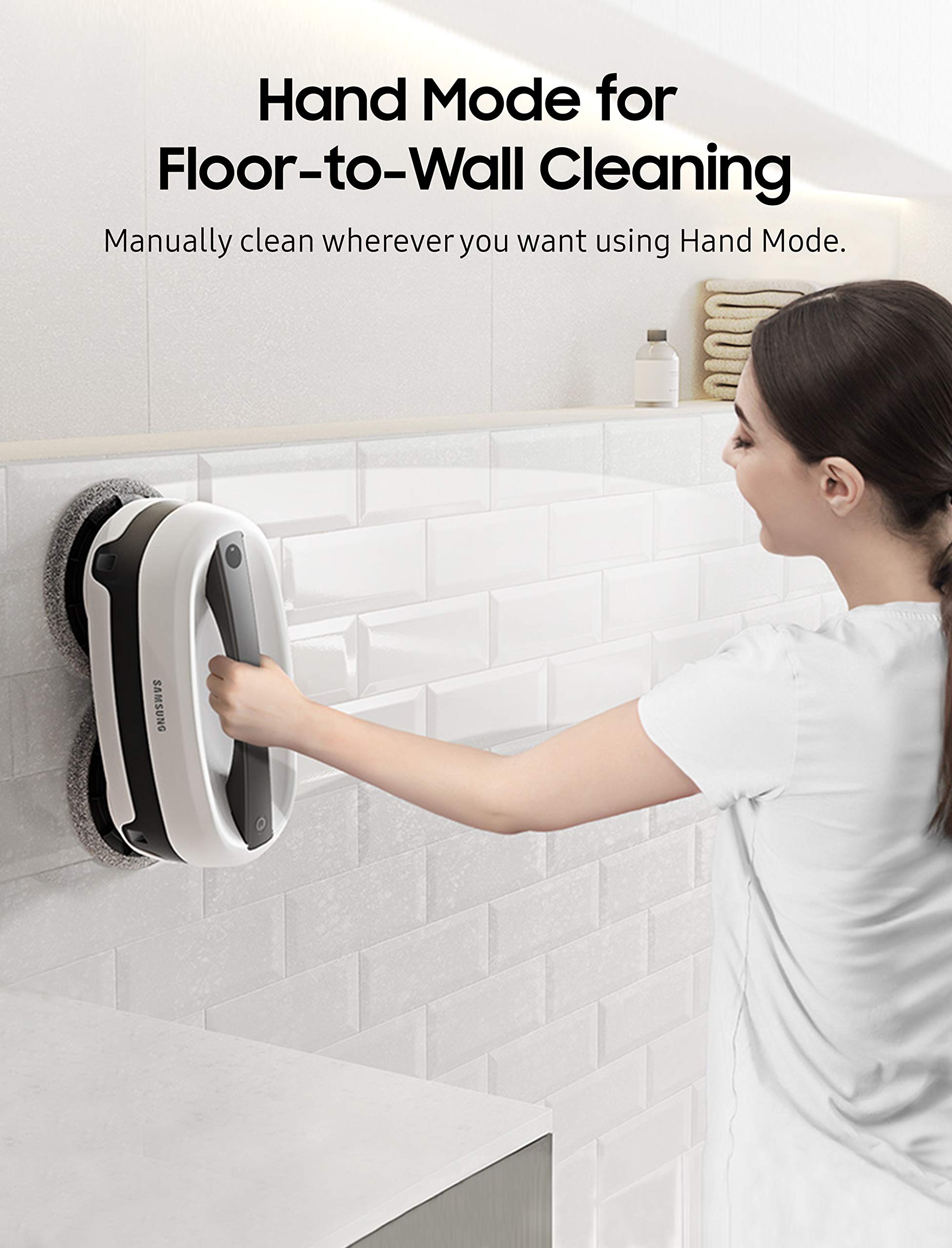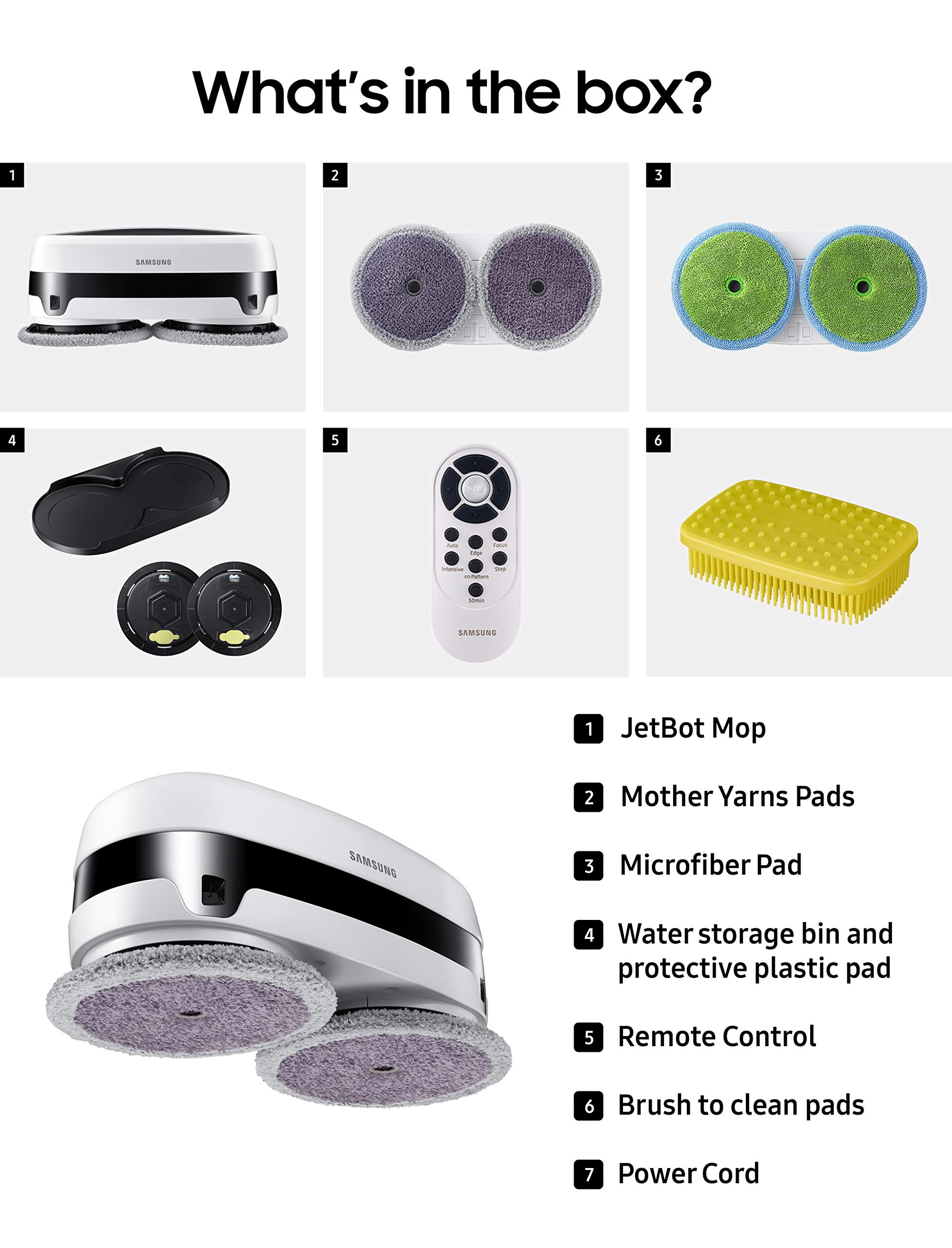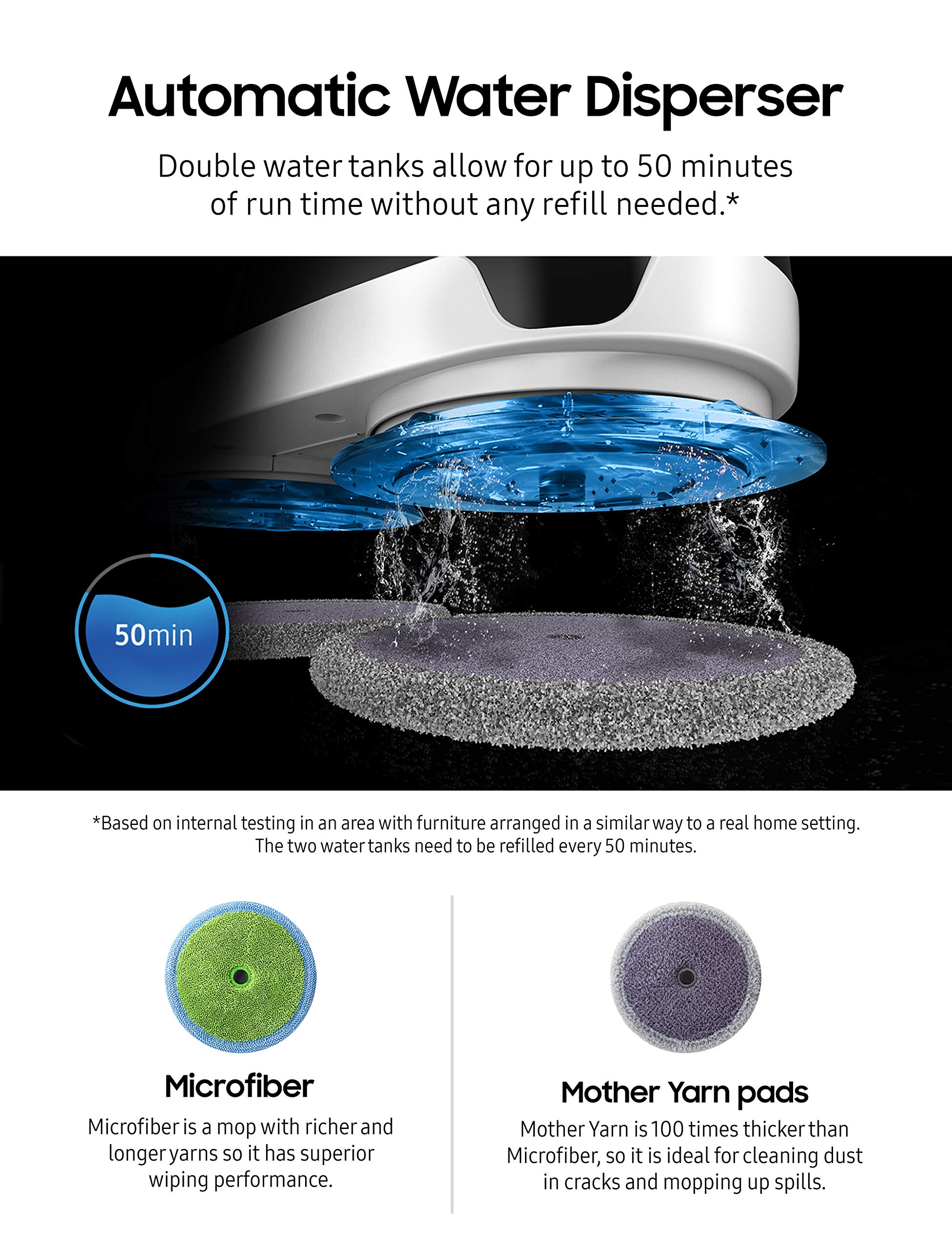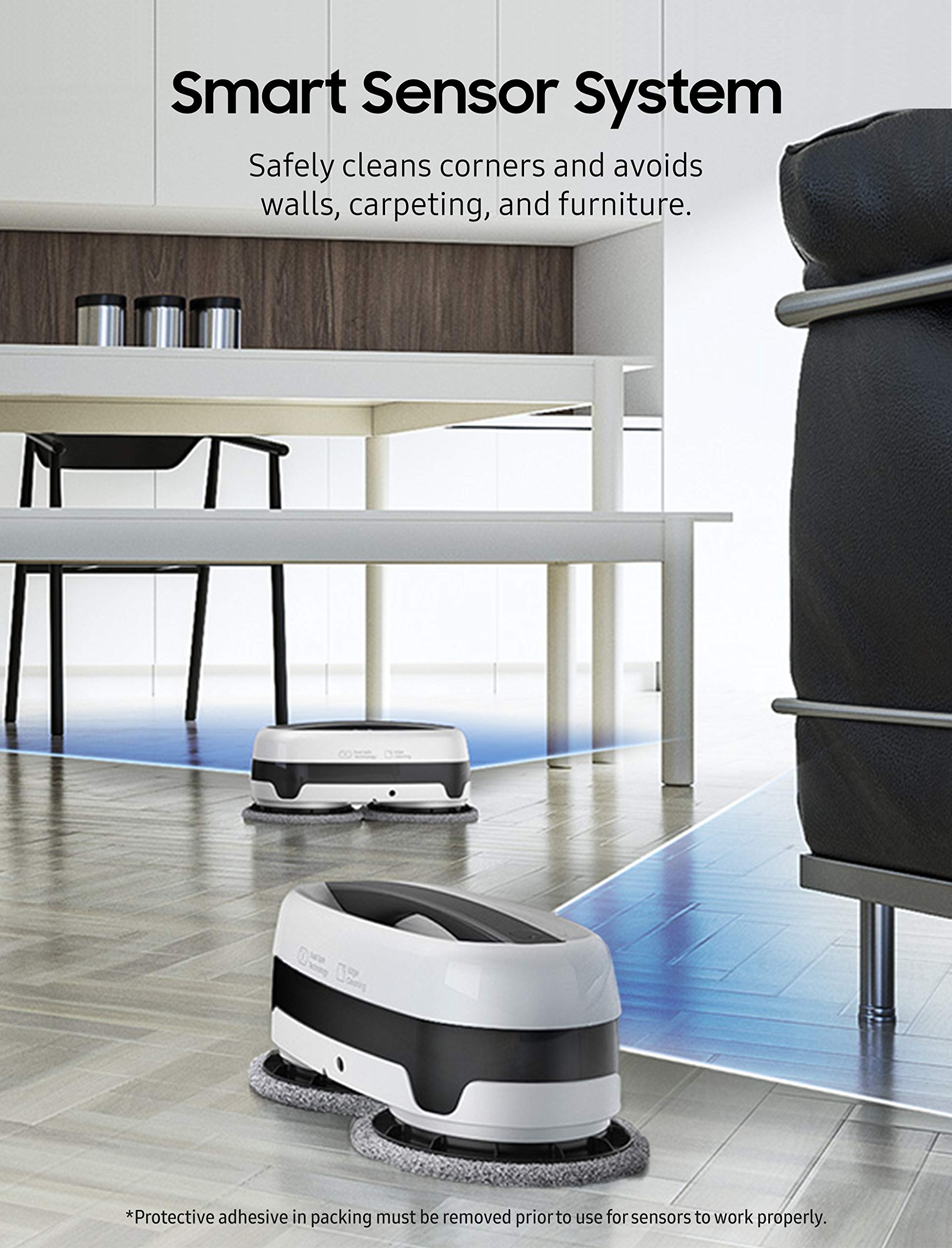 Sit back, relax, and let the Samsung Jetbot Mop automatically clean your floors. The electronic, cordless mop is designed to clean all types of floors from tile, vinyl, laminate, and hardwood. The dual spinning pads are powerful enough to move, turn, and clean simultaneously, while the smart system sensor allows the mop to safely navigate your home. The double water tanks and the long lasting-battery will let this robotic mop intelligently clean dust, dirt, and grime for up to 50 minutes before a water refill* and up to 100 minutes before a recharge.*** With 8 different cleaning modes (Hand Mode, Focus Mode, and Random Mode to name a few) and two types of machine washable pads, the Jetbot Mop does the hard work for you. *Based on internal testing in an area with furniture arranged in a similar way to a real home setting. The two water tanks need to be refilled every 50 minutes. **Protective adhesive in packing must be removed prior to use for sensors to work properly. ***Because of this capacity, it may also allow you to mop multiple times on a single charge.