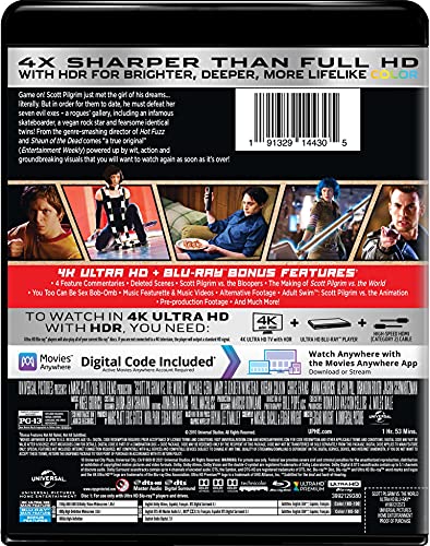Game on! Scott Pilgrim just met the girl of his dreams…literally. But in order for them to date, he must defeat her seven evil exes—a rogues' gallery, including an infamous skateboarder, a vegan rock star and fearsome identical twins! From the genre-smashing director of Hot Fuzz and Shaun of the Dead comes "a true original" (Entertainment Weekly) powered up by wit, action and groundbreaking visuals that you will want to watch again as soon as it's over! Bonus Content: Includes 4K UHD, Blu-ray and a digital copy of Scott Pilgrim vs. The World (Subject to expiration. Go to NBCUCodes.com for details.) Features Dolby Vision and HDR10 for Brighter, Deeper, More Lifelike Color Deleted Scenes Scott Pilgrim vs. The Bloopers Documentaries Alternative Footage Pre-Production Music Promos Visual Effects Soundworks Collection: Sound for Film Profile Trailers Adult Swim: Scott Pilgrim vs. The Animation Scott Pilgrim vs. the Censors: TV Safe Version Blogs Galleries Trivia Track - Subtitle Track Credits - Static Cast Commentary with Anna Kendrick, Aubrey Plaza, Kieran Culkin & Mark Webber Feature Commentary with Director/Co-Writer Edgar Wright & Co-Writer Michael Bacall and Author Bryan Lee O'Malley Cast Commentary with Michael Cera, Jason Schwartsman, Mary Elizabeth Winstead, Ellen Wong & Brandon Routh Technical Commentary with Director/Co-Writer Edgar Wright and Director of Photography Bill Pope Deleted Scenes Commentary by DirectorCo-Writer Edgar Wright U-Control: Storyboard Picture in Picture Making of Scott Pilgrim vs. the World Music Featurette You Too Can Be Sex Bob-Omb Alternative Edits Bits and Pieces Pre-Production Footage Animatics Rehearsal Videos Props, Rigs and Set Montage Casting Tapes Hair and Make-up Footage Music Videos OSYMYSO Remixes VFX Before & After Foxy Fight / Ribbon Version Phantom Montage: Hi Speed Footage Theatrical Trailers TV Spots Video Game Trailers Trivia Track Cast Commentary with Michael Cera, Jason Schwartzman, Mary Elizabeth Winstead, Ellen Wong & Brandon Routh