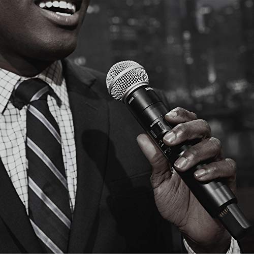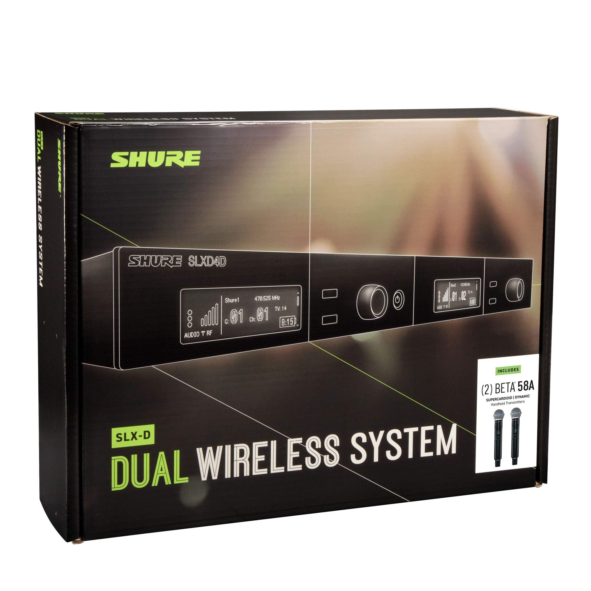 -WHAT'S IN THE BOX: (2) SLXD2 handheld transmitter with Beta 58A cardioid dynamic microphone capsules and (1) SLXD4D dual-channel receiver, with antenna and rackmount accessories, (2) zippered bag and (4) AA batteries